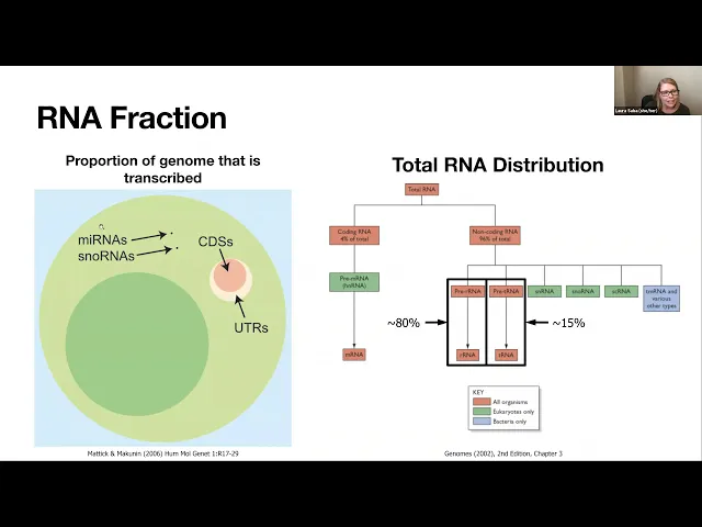 if we break down this total rna distribution a bit more um we would get that only five percent of the total rna is codeine meaning pro and it's translated into a protein where about 80 percent is ribosomal rna and about 15 is transfer rna and so there's a few different ways to decide on what fraction you want to want so a typical traditional rna-seq study we're going to go in and pull anything out of our rna pool that has a poly a tail and so the reason why we're doing this is we're really trying to