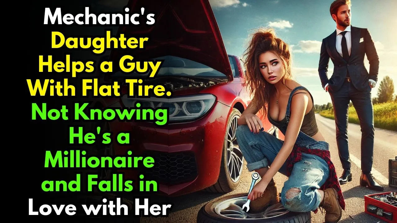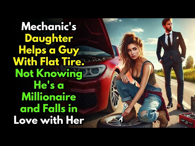 mechanic's daughter helps a guy with flat tire not knowing he's a millionaire and falls in love with her the sun hung low in the sky casting an orange glow across the sprawling fields that lined the narrow Country Road Daniel Wright pulled his luxury car to the shoulder exhaling sharply as he stepped out to inspect the damage his designer loafers crunched against the gravel and the sight of the flat tire made him groan of all places to get a flat perfect he muttered running a hand through his neatly styled hair he pulled out his phone to