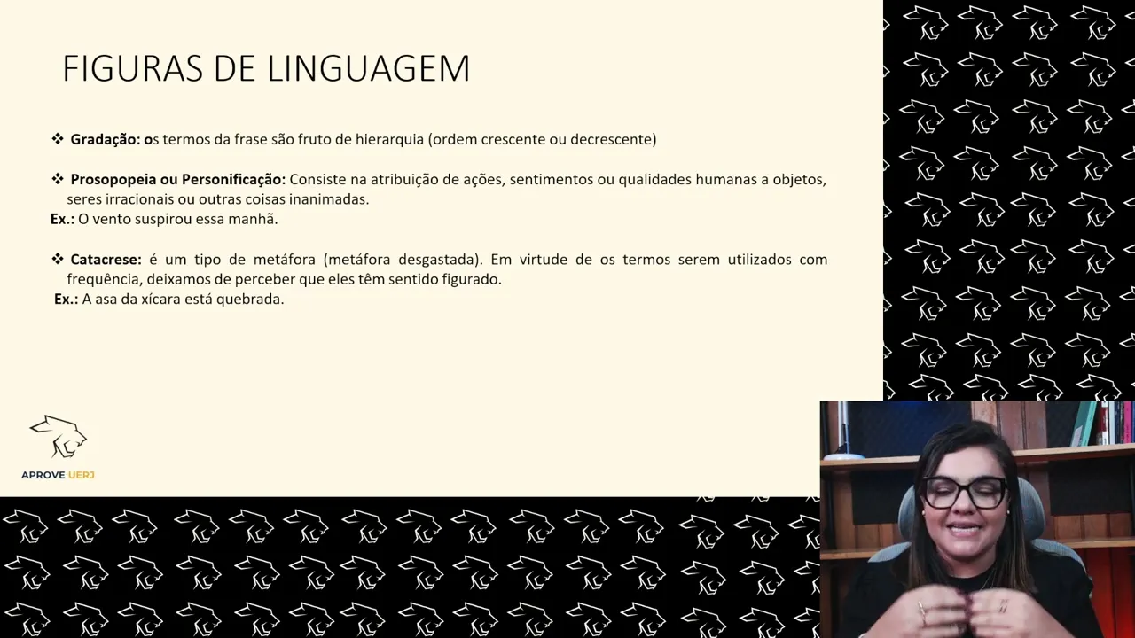 falar por exemplo ã eu suspirei respirei e foi sabe essa essa ideia de crescimento sabe eu eu levantei andei corri é uma gradação então todas as vezes você vai ter ele mais ou menos dois ou três duas ou três palavras que vão trazer essa ideia de crescimento de hierarquia pra gente tá a prosopopea personificação quando a gente atribui características humanas a seres animados tá a gente pode também dentro dessa ideia atribuir características animais a seres inanimados ou a pessoas também tudo entra como personificação ou prosopopeia o vento suspirou essa manhã né já viu vento suspirar