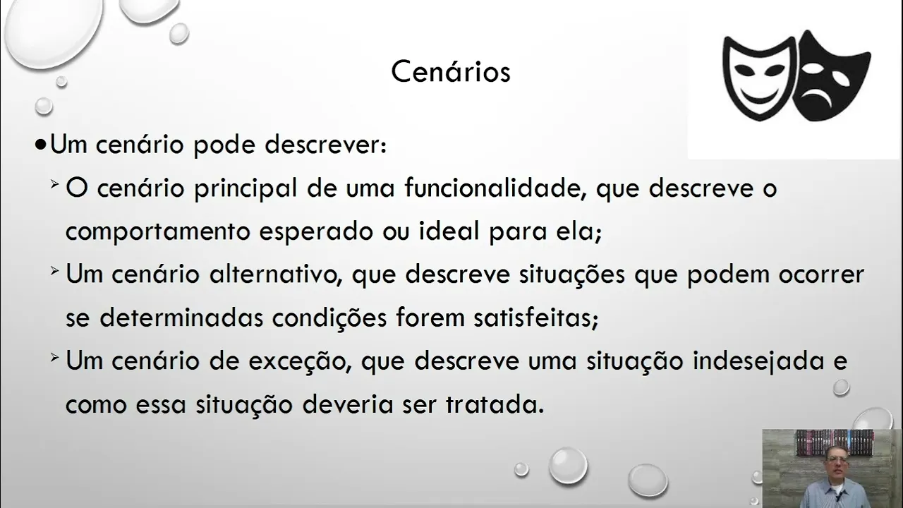 descreve como uma funcionalidade irá se comportar em uma situação elas apresentam as ações que o usuário executa em durante nesse cenário e quais serão as respostas do sistema então basicamente um cenário é uma história ele descreve uma situação onde uma ou mais pessoas irão eh executar uma atividade um conjunto de passos no sistema então cenários costumam apresentar uma narrativa rica em detalhes contextuais e eles devem ter no mínimo um ator principal podem haver outros atores secundários e um objetivo um cenário ele pode É um cenário é basicamente texto em suas representações mais simples tá então