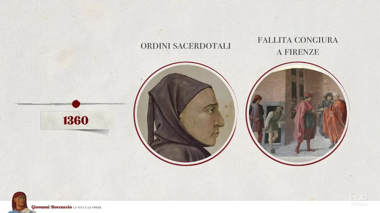 che nel 1348 colpisce la città la sconvolgente esperienza dall'avvio subito dopo alla scrittura del suo capolavoro il decameron negli anni successivi boccaccio svolge alcuni incarichi diplomatici per conto del comune e nel 1350 conosce petrarca di passaggio a firenze tra i due intellettuali inizia una fitta corrispondenza gli ordini sacerdotali assunti per ovviare alle necessità economiche e alcune turbolenze nella politica cittadina lo allontanano dalla vita collettiva negli ultimi anni si ritira a certaldo dedicandosi alla scrittura e alla celebrazione dell'opera dantesca attraverso commenti e letture pubbliche dalla giovinezza napoletana alla maturità fiorentina le opere di boccaccio sono accumunate