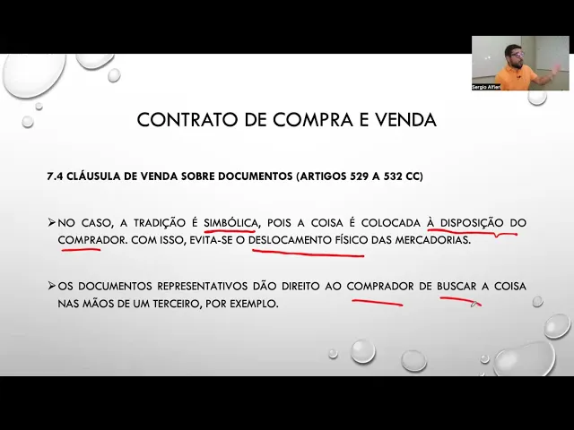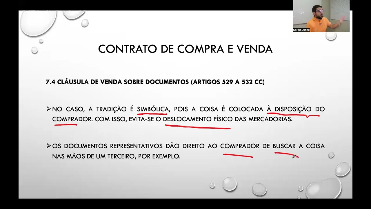os costumes dos empresários no mercado internacional então aqui nós vamos ter uma cláusula especial da compra e venda com uma importância maior no âmbito dos contratos internacionais a cláusula de venda sobre documentos também pode ser chamada de crédito documentário ou Transit Então temos aí algumas nomenclaturas que eventualmente você pode ser perguntado tá então é a cláusula de venda sobre documentos também chamada de crédito documentário veja o artigo 529 na venda sobre documentos a tradição da coisa é substituída pela entrega do seu título representativo e dos outros documentos exigidos pelo Contrato ou no silêncio deste pelos