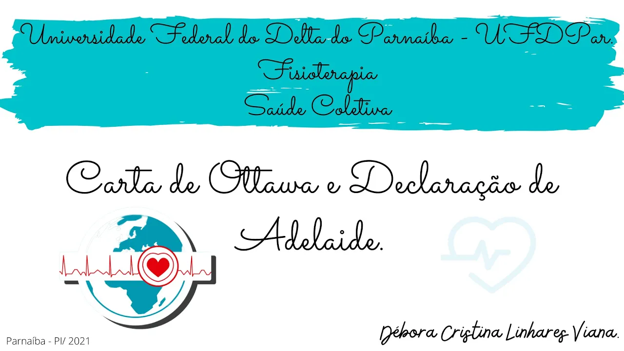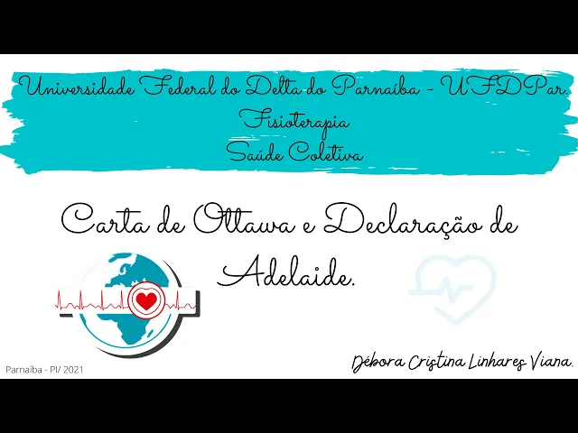 Oi gente meu nome é Débora eu sou estudante de fisioterapia da Universidade Federal do Delta do Paranaíba e eu tô aqui para falar para vocês um pouco sobre a carta de otau e a declaração de Adelaide A Carta de otau ela foi a primeira conferência internacional sobre promoção da Saúde ela tem alguns princípios que eu vou falar mais adiante mas um deles são os prérequisitos para que a saúde seja conquistada a gente vai ter a paz habitação educação alimentação renda ecossistema estável recursos sustentáveis justiça social e a Equidade ela foi realizada em otala no Canadá