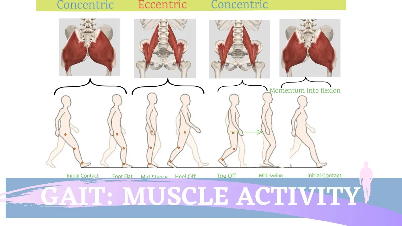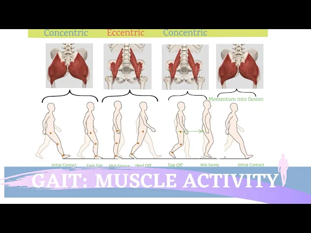 hello let's take a look at muscular activity during gait let's start at the hip joint at initial contact and foot flat gluteals are activated concentrically to bring the hip into extension at mid stance the ground reaction force moves posterior to the hip joint yet the hip continues moving into extension thus requiring hip flexors to work eccentrically up until the toe off at off the hip moves into flexion thus requiring concentric activation of hip flexors up until the mid-swing starting from the mid-swing the momentum takes over the gluteals are working eccentrically controlling the swing of the