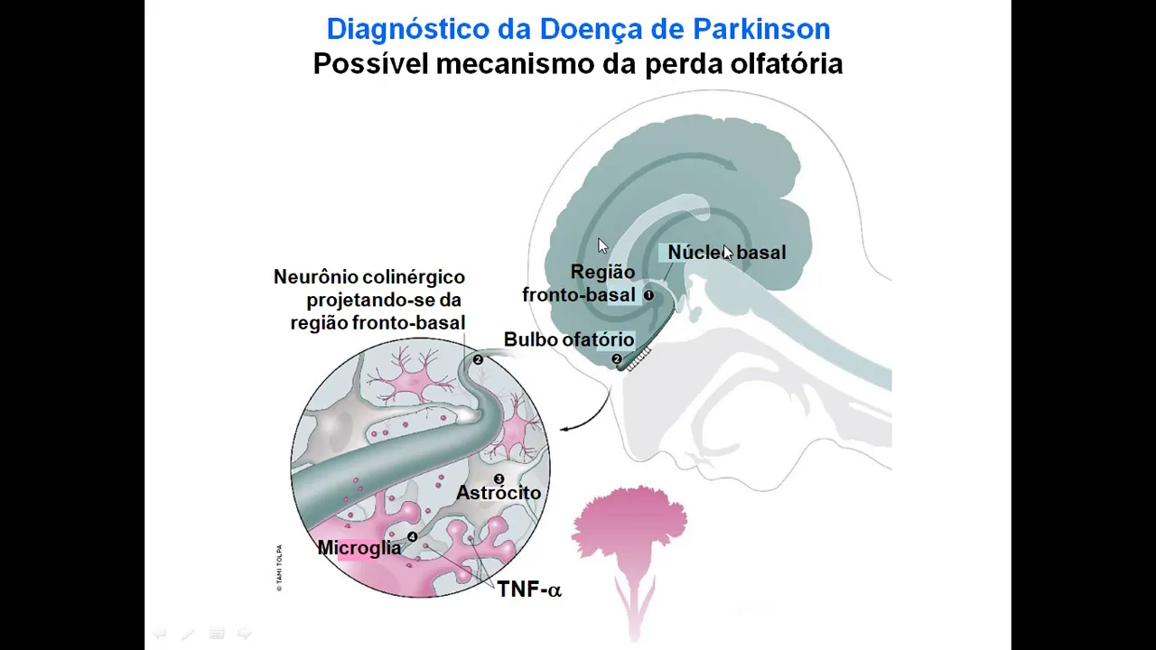 região frontobasal do Nucleo basal e isso pode causar uma resposta inflamatória pior que você vê aqui ó eu tenho astroce microblog e eles estão secretando essas pequenas esferas que a tnf-alfa é uma citocina pró-inflamatória e aqui está o Neu o médico do bulbo olfatório projetado entre essas células esse neurônio aquele pode se degenerar por causa dessa inflamação e é por isso que a pessoa ela tem perda olfatório na doença de Parkinson é bom Como surge a doença de Parkinson a nível biológico a ausência de parques a nível biológico ela surge porque a formação de um