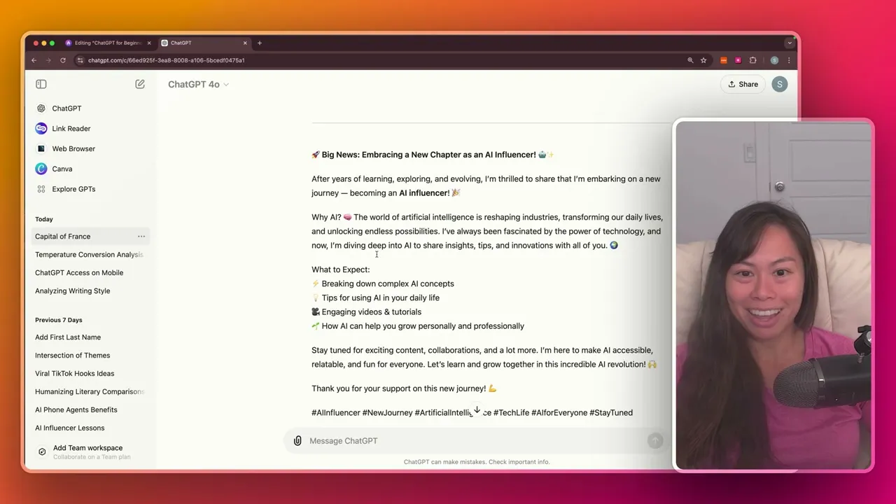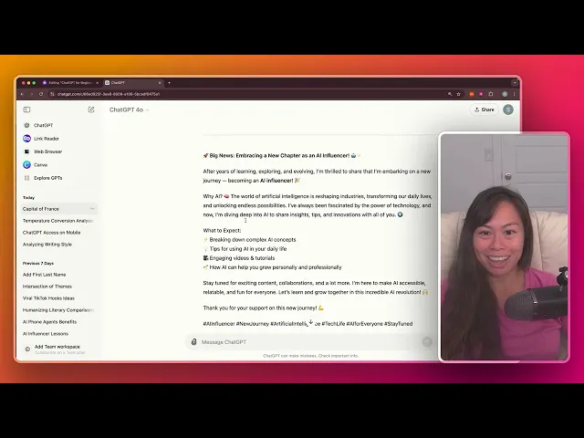 project or initiative writing stories poems even writing an email response for work or helping craft a social media post let's just say help me write a Facebook post announcing my career transition to being an AI influencer now Chach is drafting a Facebook post where I'm announcing my career Chan and now what you can do is you know go ahead and copy this to Facebook make tweaks and edits before you hit publish but let's say for example you're not happy with this you could say I don't the messaging too many emojis sound more professional okay and