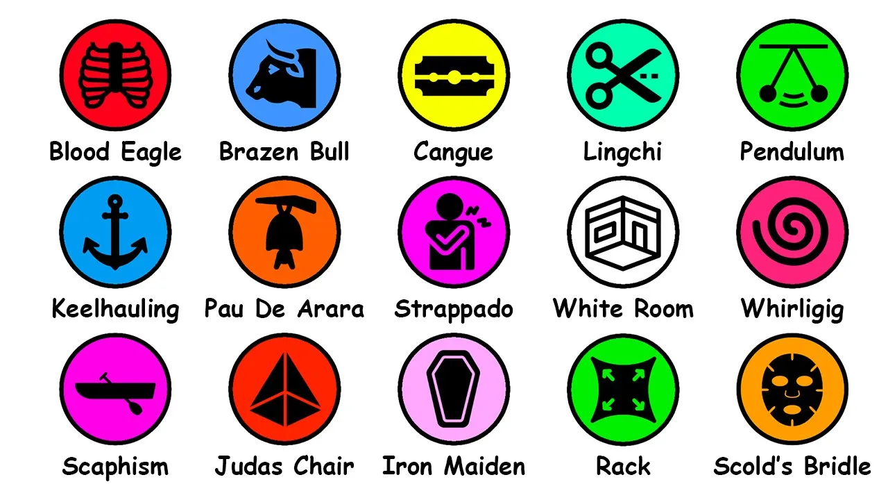 just about physical pain but also about feeling embarrassed in front of others caster oil making someone drink a lot of castor oil caused stomach pain and made them so sick that they could no longer hold their poop together then they would put the person in a big human-sized barrel and remove them when the person confessed this could even go as far as leaving the person to drown on their own body fluids inside the barrel choke pair a metal tool that was put into someone's mouth or anus and then made bigger on purpose the tool would