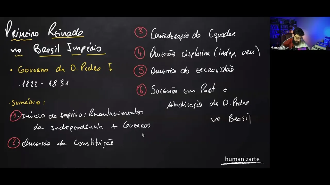 tópicos primeiro o início do Brasil independente depois a primeira constituição brasileira Como que foi o grande movimento de resistência a Pedro no nordeste chamado de Confederação do Equador depois a independência do Uruguai e como isso abalou o governo de Dom Pedro I as discussões sobre escravidão no Brasil da época e como isso foi ruim pro governo de Dom Pedro Até que a gente chegue daí na história da abdicação dele e a gente possa Finalmente entender por que ele abdicou beleza então a partir de agora que a gente tem esse sumário pronto eu vou voltar nessa