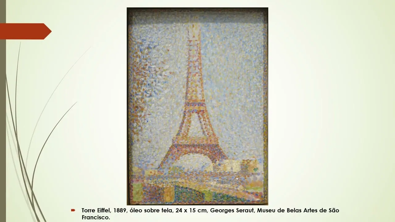torre eiel vou até voltar aqui na imagem para vocês acompanharem um pouquinho mais a gente pode pensar que a torre eel ela não é apenas uma representação visual né dessa estrutura lá de de Paris mas é também considerada uma obra muito importante do movimento pontilhista porque porque eh ao explorar esse uso meticuloso de pontos de cor e compreendendo também o contexto histórico como eu disse para vocês a gente pode eh apreciar não apenas a partir dessa dessa dessa questão estética da pintura mas também a habilidade do artista em traduzir esse esse espírito da época né