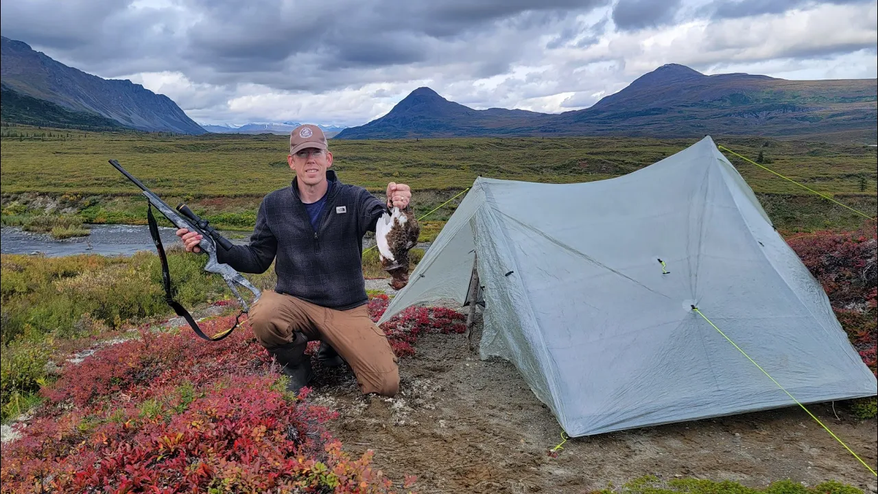 is the berries don't fall off in the fall even if there's snow on the ground you can find rosehip bushes with rose hips still on them I brought my 22 rifle with me I'm really hoping to get a chance to shoot a tarm again tarmigan are kind of like a wild chicken they're absolutely delicious and they change colors they're brown in the summer and white in the winter so they're really well camouflaged but they're kind of noisy so I'm keeping an ear out for tarmigan calls there's also a ton of wild berries and edible plants