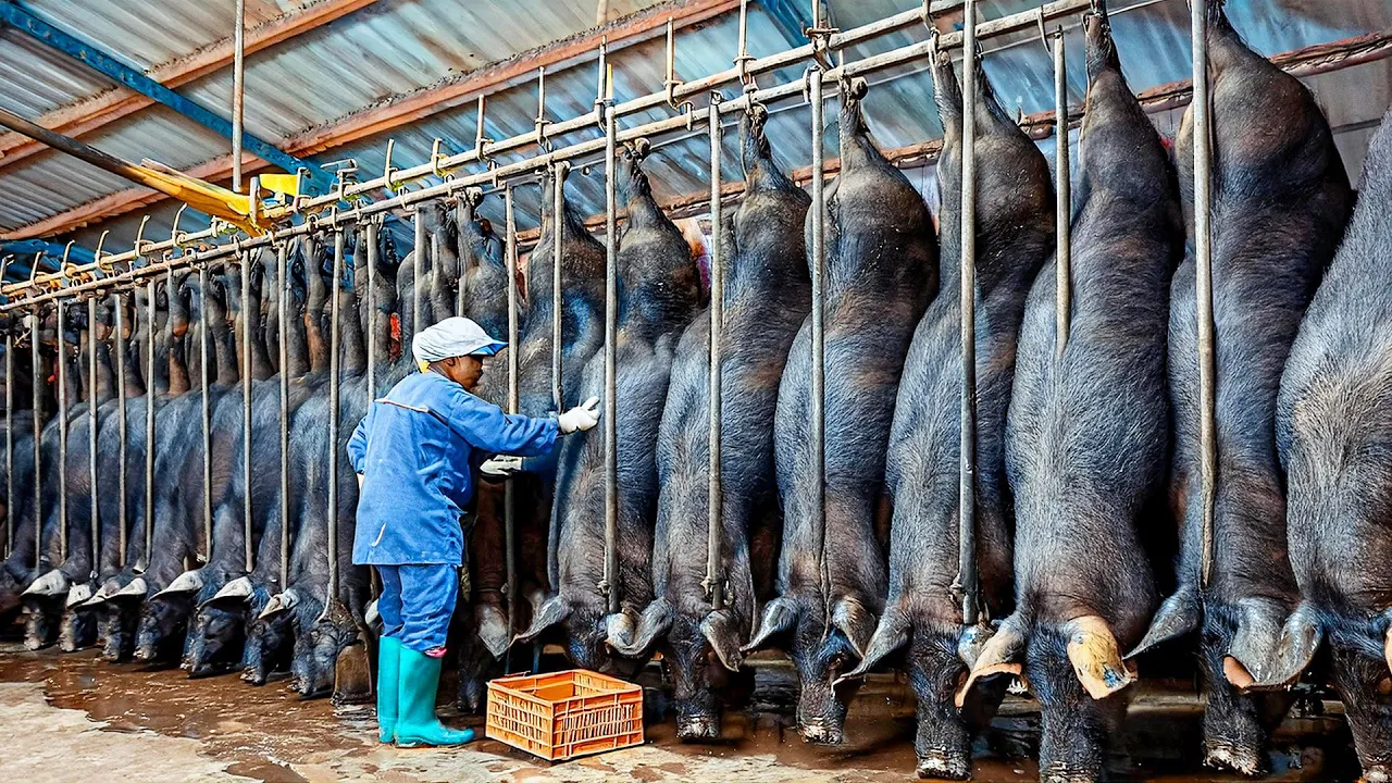 black pigs on farms is also becoming popular to combine Advanced Techniques with the natural advantages of black pig breeds aiming to optimize meat quality and economic efficiency [Music] oh [Music] once they reach maturity whether raised in the wild or on farms the pigs inevitably undergo processing in a factory of course this is also the most crucial stage in understanding why the consumption of black pigs is so high the leg is the most important part for processing salted ham so it is carefully separated to avoid damaging the meat structure [Music] [Music] [Music] [Music] in the first