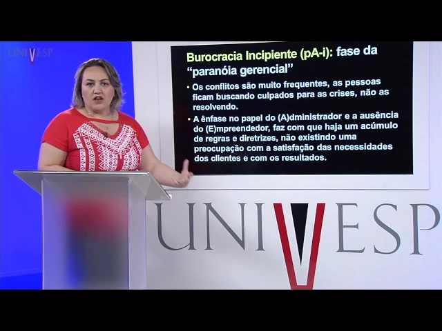 fase é muito forte a cultura organizacional é uma é muito forte a questão da não mudança dessa cultura as pessoas costumam dizer que isso sempre foi feito desse jeito para que mudar Eh vamos continuar fazendo E aí as o o a ideia é que as não os problemas por isso que ela é uma fase da aristocracia Porque quanto menos a gente mostra os problemas melhor vai parecer que nós estamos funcionando muito bem e problemas não precisam ser resolvidos na burocracia incipiente a gente já percebe uma ausência completa do papel do Empreendedor e é uma fase