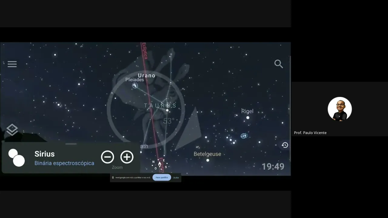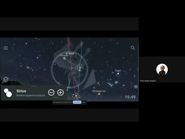 para mim não vou vou desligar minha câmera então que acho talvez ela apareça se eu desligar a câmera temporariamente ele aparece vê se vê agora ah agora foi agora foi então vou desligar a câmera Temporariamente só na voz bom eu peço aos alunos instalem o estelo e vamos tentar apontar pro céu não funciona em qualquer celular porque tem que ter bússola no celular e aparelhos mais simples não tem bússola então ele vai instalar mas você não vai conseguir fazer esse curso de rotacionar a medida que você quer ver alguma coisa então eu costumo chegar pros