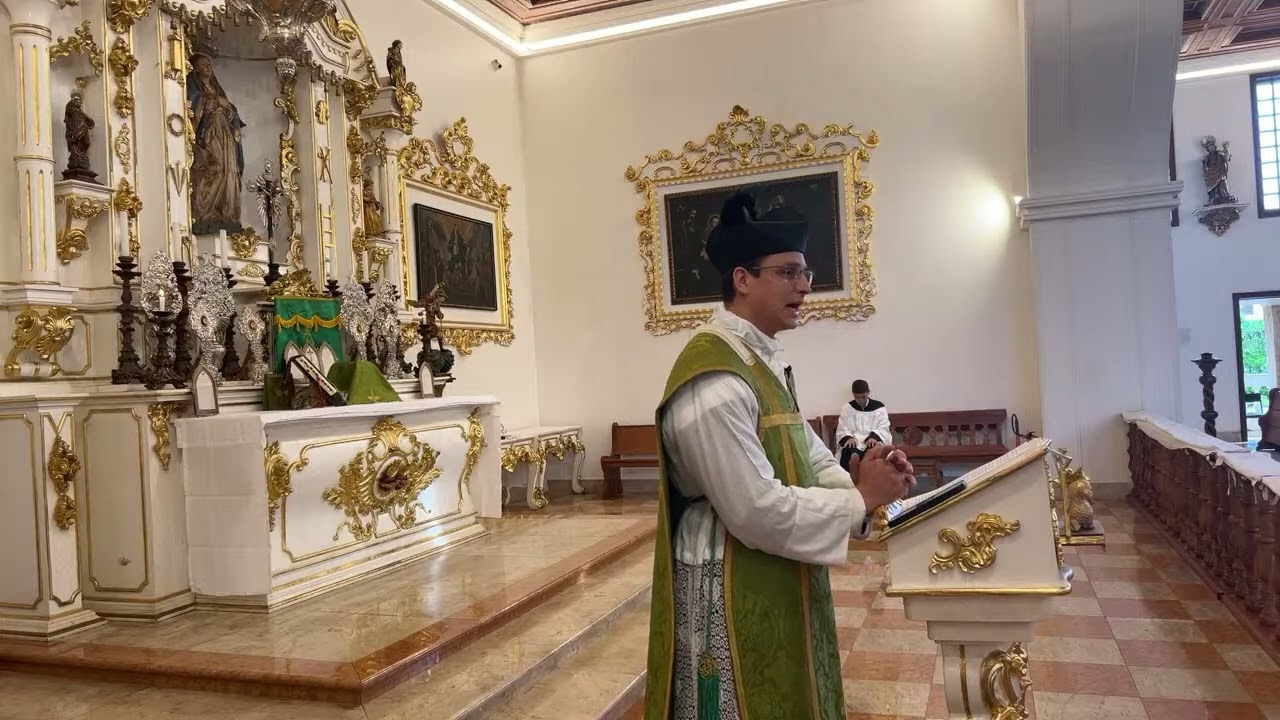 de joelhos e na boca abre-se a boca coloca-se a língua para fora apoiando-a no lábio de baixo e não se mexe a cabeça o padre já calcula o movimento dele e se o fiel mexe a cabeça pode acontecer um acidente ó pode cair E lembramos não é o fiel que fala Amém aou receber a comunhão é o padre que fala caríssimos são Paulo na epístola de hoje essa primeira epístola aos Tessalonicenses a primeira epístola que São Paulo escreveu faz um elogio tocante muito vivo dos fiéis que Ele formou para Jesus Cristo que eu cito de