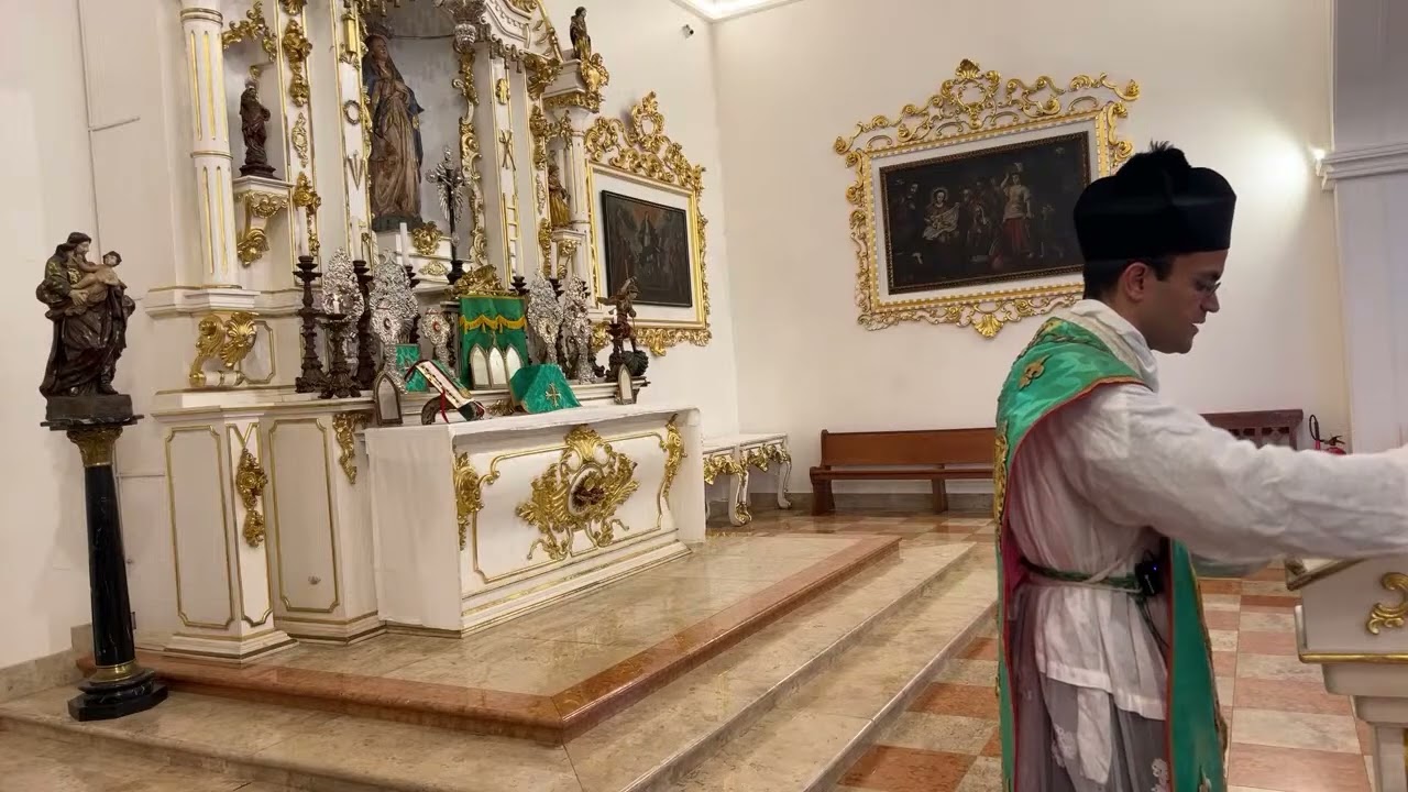 em nome do pai do filho e do Espírito Santo amém ave maria cheia de graça o senhor é convosco bendita sois vós entre as mulheres e bendito é o fruto do vosso ventre Jesus santa Maria mãe de Deus rogai por nós pecadores agora e na H de Nossa Nossa Senhora das Dores Rai por podem sentar por favor é só um breve aviso lembramos sempre as regras para receber a sagrada comunhão para comungar necessário ser batizado católico sem mistura de outras ou religiões não ter nenhum pecado mortal na consciência que não tenha sido confessado estar de