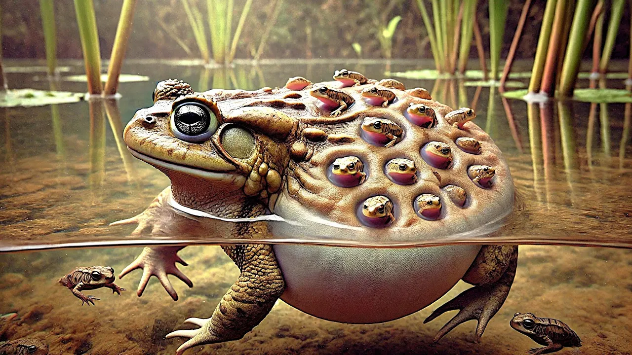 a weird way of having babies wait until you hear about the Surinam toad this amphibian turns its back into a living Nursery found in the waters of South America the female Surinam toad has a flat almost pancake like body perfect for her unique method of childbirth during mating the male seram toad places the eggs on the females back where they stick what happens next seems like something out of a sci-fi movie her skin grows over the eggs forming Pockets that encase them these Pockets protect the developing eggs from predators and the environment as they mature
