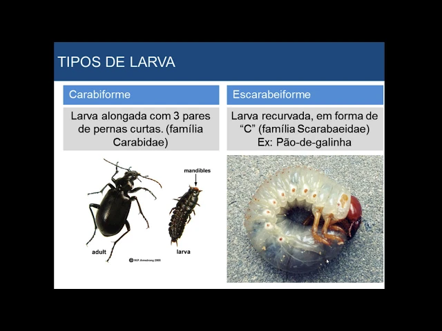 o bicudo veja o bico da cana-de-açúcar e o bicudo do algodão em possuem esta característica que de larva então quando você vê essa larva aqui né é você já fecha o diagnóstico você já sabe aqui você acha assim né dessa família de um dos coleóptilos cor colei unidade 1 o outro chip larva é a carabiforme cara de forme ela é típico da família carabidae dá uma olhada aqui né é esse daqui é um aspecto da larga esse aqui é o adulto essa aqui é a larva é da família carabidae ou pode ser também escarabeiforme é