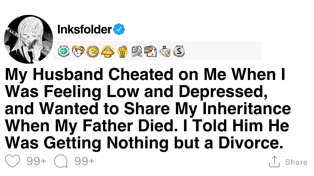 my husband cheated on me when I was feeling low and depressed and wanted to share my inheritance when my father died I told him he was getting nothing but a divorce I 30f need to get this off my chest because I feel like I'm drowning in a sea of emotions and I don't know how to stay afloat anymore my life has turned upside down in the past six months and I'm struggling to make sense of it all 6 months ago I lost my mom to cancer she was more than just my mother she was my