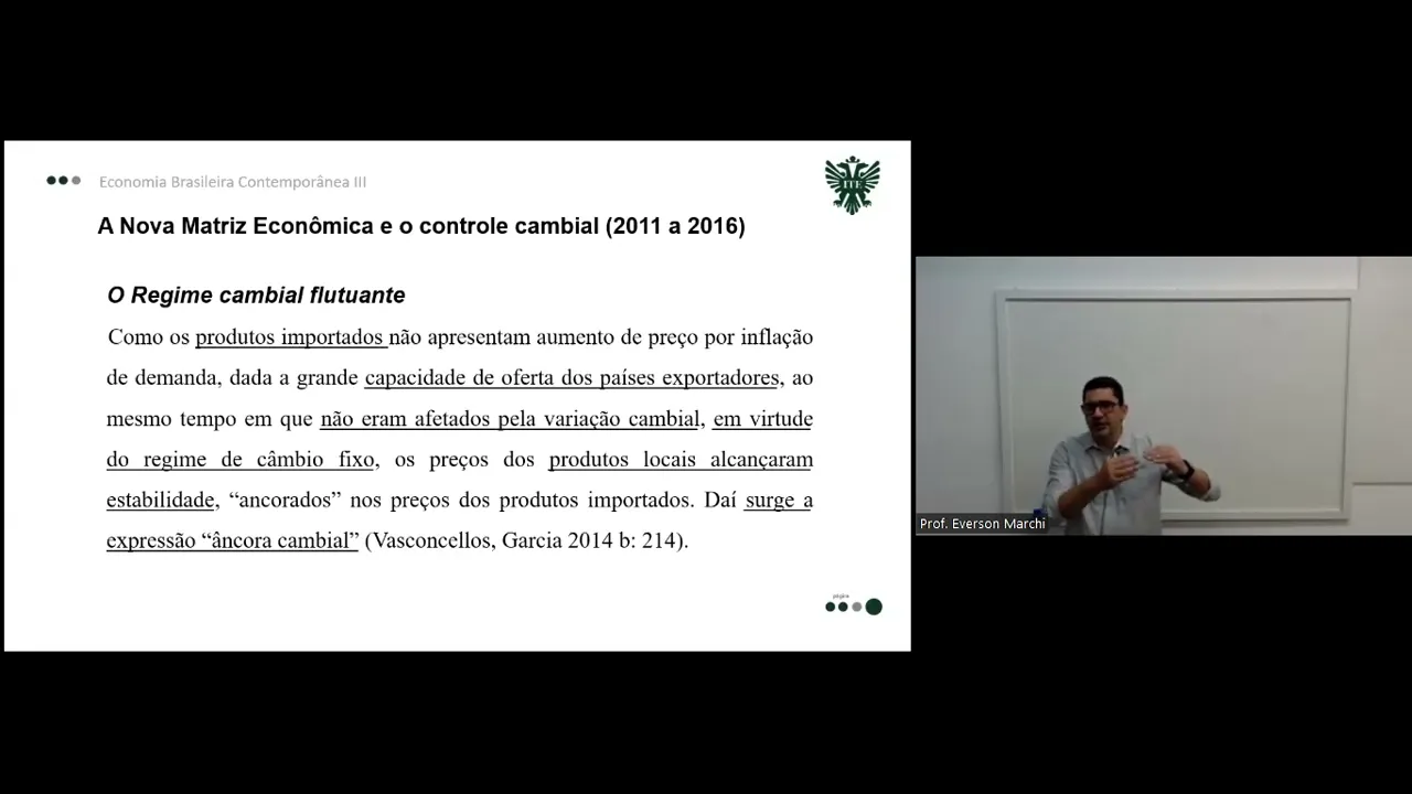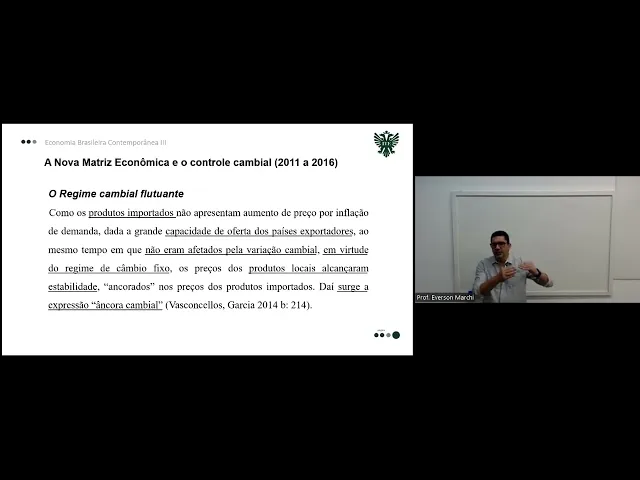 E aí pessoal tudo bem Dá continuidade aqui sequência à nossa discussão sobre a economia brasileira contemporânea né na última aula a gente falou sobre um contexto um cenário econômico do do período do Governo da Dilma Roussef né situações que que que foram enfrentadas nesse nesse período de que forma que que foi tratado né alguns assuntos na na nessa parte da economia e hoje e na próxima aula nós vamos falar um pouquinho eh sobre a nova matriz econômica implementada por esse por esse governo já falamos um pouquinho antes e eu vou usar como base um artigo vou até disponibilizar para vocês depois tá que fala e esse artigo ele vai eh falar das situações na época da implantação do plano real sobre o governo Lula sobre o governo Dilma né traçar e as características os pontos de cada de cada política que foi adotada e de que forma que foi eh trazida essa essa situação de que forma que foi feita a gestão administrado essa essa situação Então vou disponibilizar depois o artigo para vocês no material vocês têm aí a faz o acompanhamento e facilita também para interpretar caso fique faltando né algum alguma explicação ou eh eh dentro do contexto do que eu tô falando falta alguma informação para vocês Vocês conseguem acompanhar lá também tá bom então eh a gente vai começar a falar um pouquinho sobre o regime cambial flutuante a função da taxa de câmbio né Eh ela parte da da da da seguinte premissa quando a gente fala no controle da inflação se os consumidores internos tiverem acesso facilitado aos produtos importados isso vai desestimular os produtos locais aumentarem os preços de seus produtos né enfrentando aí concorrência com preços estáveis e competitivos isso foi o que ocorreu lá na época do Governo da implantação do governo do da implantação do plano real nesse período nós tínhamos uma economia internacional eh totalmente estável né não tinha os preços estavam equilibrados nós não tínhamos preços altos naquele período o o governo mantém Então essa eh a abertura da importação desses produtos pro país ele consegue manter o equilíbrio da oferta desses produtos para paraa população brasileira e ao mesmo tempo o preço desses produtos acaba provocando uma estabilidade no preço interno Por quê o preço lá fora Ele tá equilibrado né Eh Só lembrando a gente tinha aí o valor de 1 Dólar por R 1 né então havia uma estabilidade da moeda também era uma taxa cambial fixa não era flutuante e você mantém Então os preços equilibrados então o preço lá de fora é o mesmo preço aqui interno e essa esse essa estabilidade do preço lá fora acaba criando uma estabilidade do preço interno aqui no país também é claro que a gente já viu isso né o custo dessa dessas eh do do regime cambial fixo é caro pro governo a partir do momento que há necessidade de custear essa essa essa esse câmbio fixo né o governo ele vai tendo alguns prejuízos tanto que chega no final do governo ele precisa inclusive fazer o empréstimo junto a FMI então a ideia né quando você tem o câmbio flutuante o câmbio câmbio fixo é manter essa situação com base nisso né se a gente já viu que o o Real então ganhou o poder de compra no mercado internacional isso possibilitou aí a importação de uma infinidade de produtos que provoca competição com os produtos nacionais n simuland aí os produtores locais aumentar o preço interno Eh toda essa esse controle né durante o a implantação do do do plano real nós vamos ver que vai ter uma alteração no finalzinho desse governo do governo Itamar Franco desculpa do Fernando Henrique Cardoso a partir do do da mudança de governo pro Lula esse câmbio já está flutuante né que a gente chama de híbrido quando o governo então ele interfere quando há necessidade da interferência desse câmbio eh então com o câmbio flutuante nós já temos um um um problema onde quando o câmbio ele começa a ter um aumento de de de preço né um aumento esse esse essa taxa cambial ela começa a variar muito o que que acontece com os preços aqui eh internos do país eles tendem também a subir nós estávamos falando de de uma taxa de um para um né um dólar R real imagina eh que esse o valor da taxa cambial ela suba para R 5 Então os preços dos produtos que nós estamos comprando lá fora ele vem aqui pro pro país ao preço de r$ 5 e não mais de R 1 até aí tudo bem né só que nós temos uma demanda interna de um período aonde as a a população Tava tendo um ganho real de de de salário havia uma melhor distribuição da renda e a população Então tava consumindo mais quando você tem uma uma Procura pelo produto e a demanda que a a demanda de esse produto ela é superior à oferta desse produto esse o preço desse produto tende a aumentar paralelo a isso nós temos a taxa cambial Então você já tem um uma um impacto né para aumento de preço o fato de você não ter a oferta de acordo com a demanda e por outro lado também nós temos um aumento dos preços dos produtos importados que o concorrente do nosso preço interno aqui é o produto importado a partir do momento que esse preço ele aumentou Ele foi de um ele foi para cinco o preço do produto produzido aqui no no no no Brasil também tende a aumentar né ele talvez não chegue a cinco mas ele vai ter uma variação um pouco maior Por quê a concorrência dele é um preço bem maior do que a gente tinha antes então isso começa a provocar a inflação isso começa né a ter uma uma certa instabilidade nos preços então a as políticas cambiais né esse controle das políticas cambiais vem justamente buscar eh evitar esse impacto nos preços evitar esse impacto na produção na inflação eh a adoção do regime cambial fixo também teve outras consequências nesse período né No No início aí do da implantação do plano real nós tivemos aí o aumento de índice de produtividade né dada a modernização do 