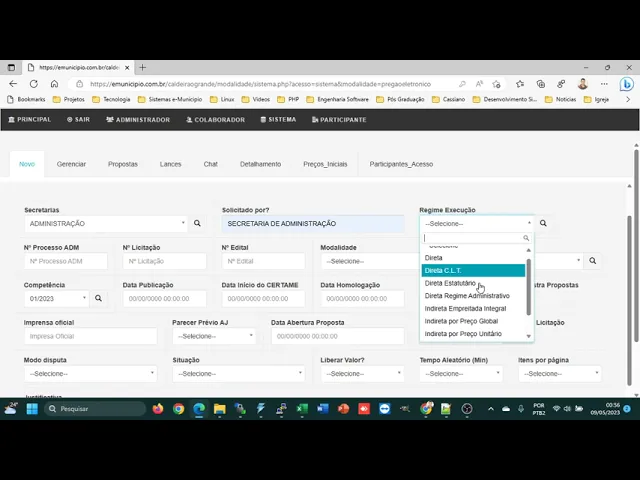 de manhã vamos digitar e criar a nossa licitação então a secretaria são pré-cadastradas no sistema né configurar Então você vai escolher uma secretaria a dizer quem foi que solicitou o número do secretário com a própria secretaria você pode digitar o regime de execução essas informações são dadas pelo siga então é necessário preencher então se você vai trabalhar com preço unitário né E que são preços e que vai ter escuta então é direta explicar você vai enxergar que eu cadastrar que foi gerado lá no sistema ou o que vocês fazem o controle pelo número do processo