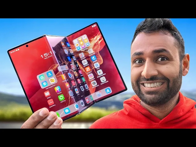 this right here is the Huawei mate XT I spent over $5,000 to get one it's the world's first triple folding phone the thing is kind of mind-blowing but as I've started to dig deeper I realized there is also something sinister going on with it so this is how the thing comes presented iPhone box size reference W there's no doubt about it this is absolutely incredible so right on top here are the Huawei free buds 5 I gave these things a 7 out of 10 when I tested all the band Huawei products got a car charger 8 watts pluming NE that's generous but then I suppose equally at the same time this is the kind of experience that you would expect anyone who's willing to pay thousands of dollars for a first generation product is a true fan and Huawei needs to make sure that those fans are looked after so in here we got tips for the earphones a bunch of papers and then a carbon fiber case okay we'll come back to this what's in here oh what so you got the mains charger which is only 66 WS how do you have a Mains charger with less power than the car charger and not one but two cables a USBC to USBC and then a USBC to usba a now before the whole we didn't even need onefold why on Earth would we need twofold Army comes to get me hear me out because there is something I think is absolutely amazing about this ever since the very first foldable phones we have had a problem I think it's fair to say that most people are interested in the idea of a phone that could become a tablet at the snap of their fingers a massive screen to watch movies or play your games on but the reason that very few people follow through and actually buy these folding phones like the ones from Samsung is price aside if you want to make it usable while it's folded it's got to be tall like a phone but then that means that when you open it it's got to be square and because videos and games are all designed to be widescreen it barely makes your experience bigger than just using a normal phone and so the only thing left for foldable is to be better at crazy multitasking but that's Niche and just be honest most people who could afford one of these already have a laptop or a proper tablet for that anyway but that is where this Huawei comes in so you open once from here and yeah in this form it is basically the same as a normal foldable AKA pretty useless for most types of content but look what happens when we open one more time the extra width from this one extra fold is an absolute GameChanger I mean like this is an iPad it's widely considered one of the best devices for catching up with your m movies on an airplane but now we have a phone that gives you practically the same viewable screen area when watching content except this one folds into something resembling this what year are we living in and what Huawei has done to achieve this is actually just as cool so this is Samsung zold 5 and when folded it is 13. 4 mm thick Samsung's very latest is 12. 1 mm huawei's triple folding phone is just 12.