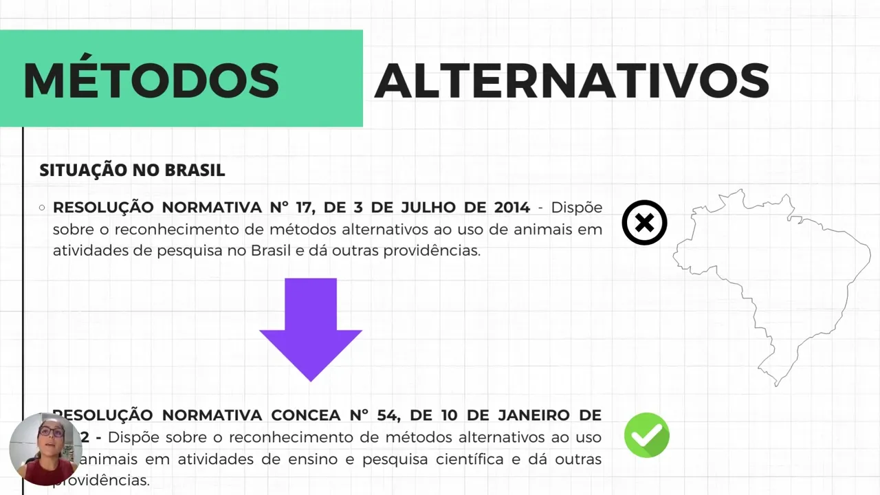 não são substituíveis por modelo eh que não seja animal né ainda não existem substitutos a não ser um modelo animal ok Então pessoal eh agora que a gente já sabe né O que são os métodos alternativos Como que o processo de validação acontece aqui dentro e também quais são vantagens e desvantagens cabe a gente fazer a seguinte pergunta né Em quais situações nós devemos buscar métodos alternativos Como assim Ângela como assim situação né a pergunta não ficou muito clara Então vamos explicar de acordo com a lei Arouca pessoal a criação e a utilização de animais
