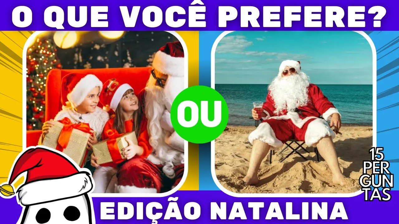 a época mais esperada e amada por muitos chegou e hoje na edição especial de Natal quero saber o que você prefere mas antes de começar já deixa o seu like se inscreva no canal E compartilhe com os amigos para que os seus desejos natalinos seja concretizado Ah e deixe suas escolhas nos comentários para receber com muito amor coraçãozinho número um o que você prefere Papai Noel ou mamãe Noel [Música] número 2 O que você prefere ganhar roupas de presente ou dinheiro de presente número 3 O que você prefere panetone ou chocotone [Música] número 4 o