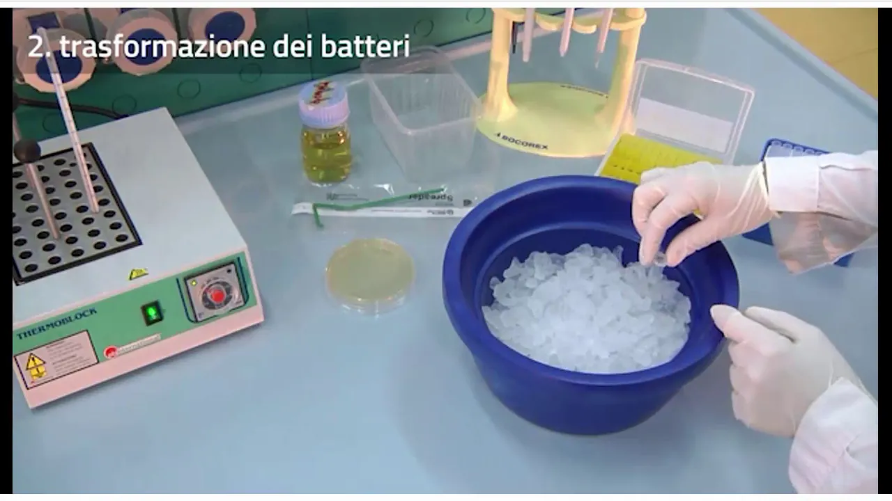 aggiungiamo 10 microlitri della riesch e la d league azione cioè il prodotto della reazione che ha permesso di salvare il gene dell'insulina all'interno del plasmide rimettiamo la in ghiaccio per 10 minuti e subito dopo trasferiamo la in un bagno a 37 gradi centigradi per 5 minuti per la fase di shock termico necessaria a far penetrare il dna all'interno dei batteri riportiamo le cellule in ghiaccio e dopo un minuto aggiungiamo 800 microlitri di terreno sterile senza antibiotico riponiamo ora la provetta in un termostato a 37 gradi centigradi per 15 minuti questa breve incubazione da ai batteri