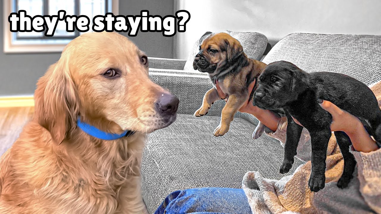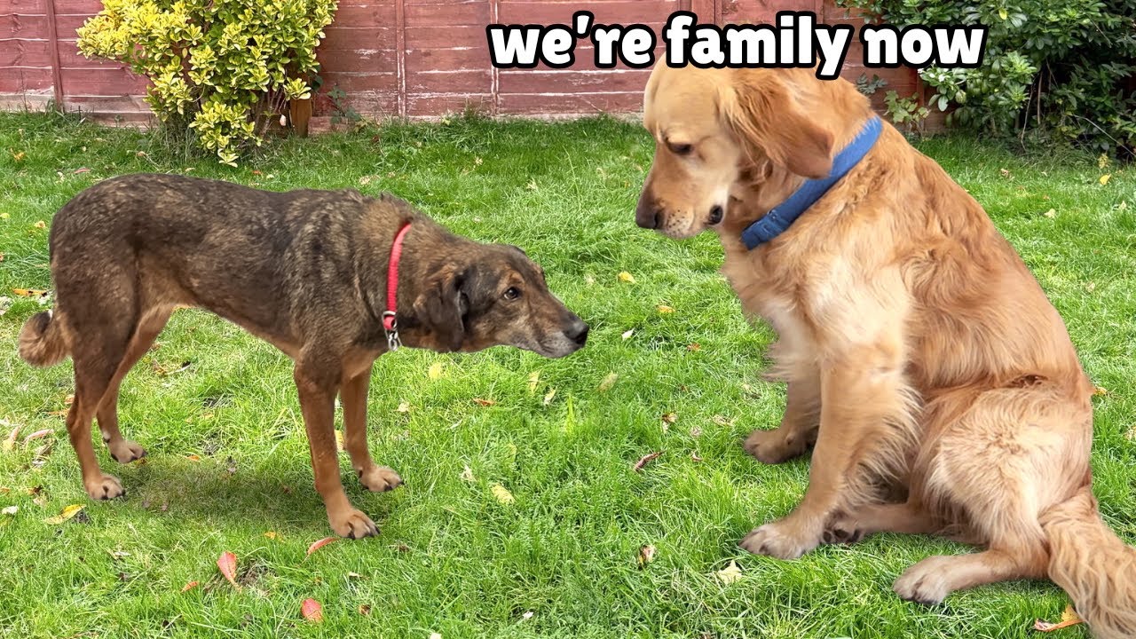 meet them both at the same time no moi no mo no Kobe's being very gentle and polite with her it's almost like he knows what she's been through Luna still has two more dogs to meet our tiny puppies Bunny and Olive [Music] the girls are like who are this Luna was really unbothered by the pups after Moi decided that Luna stinks what she having a sniff of monks Mike's mouth thought you stink we then started doing some positive training with her lead we wanted to take her outside again but didn't want her to be scared
