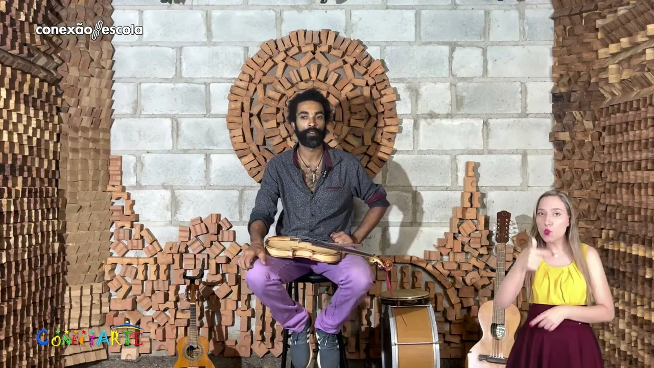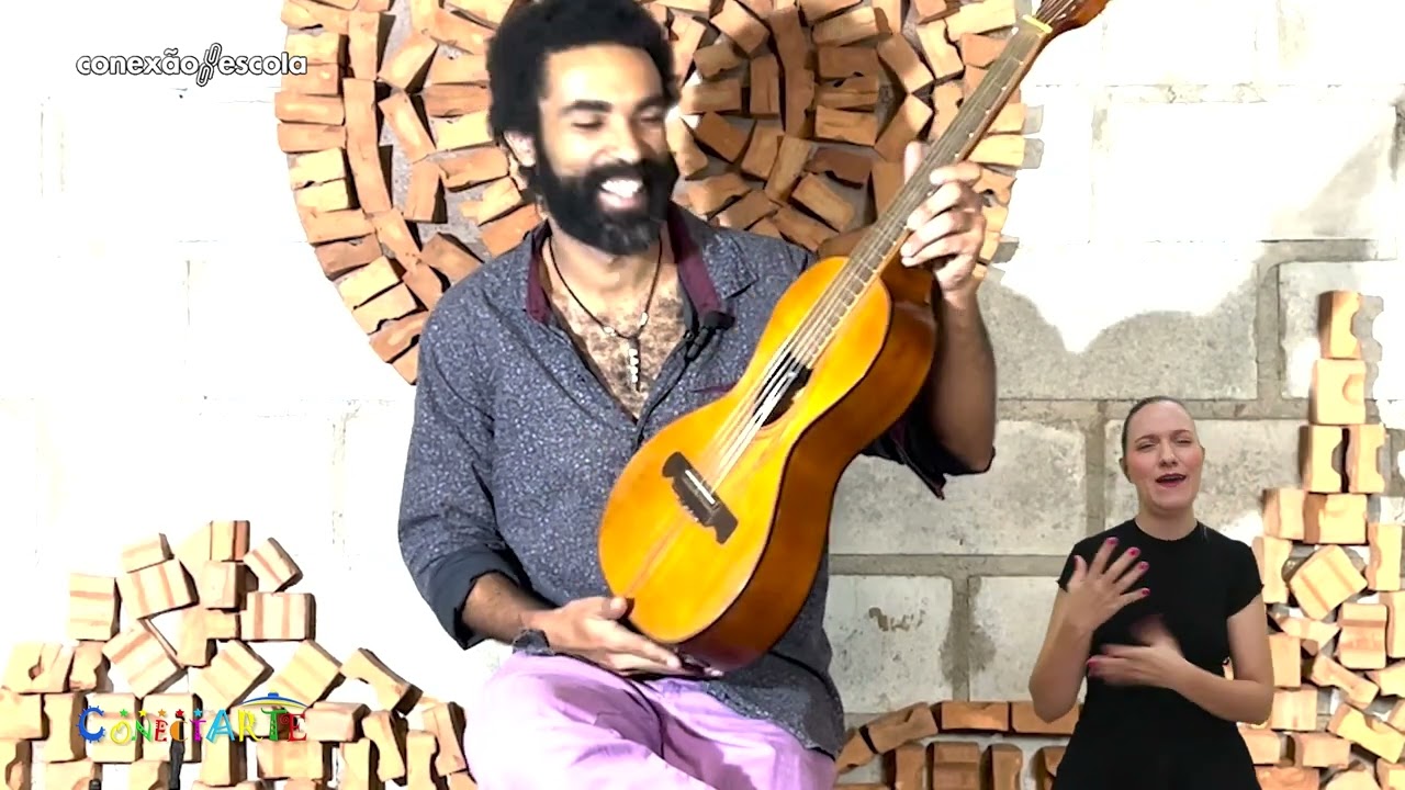 [Música] Olá pessoal bem-vindos ao conexão escola Esse é o quadro conectar-te e hoje eu estou aqui com esse artista da cultura popular África Billy África vai falar para gente seu percurso artístico e apresentar alguns instrumentos com vocês [Música] Olá pessoal eu sou África Billy conhecido por África Billy meu nome é Alessandro Billy Viana Pimenta da Silva eu nasci no Rio de Janeiro em 5 de outubro de 86 no domingo por 6 licenciatura de geografia eu fiz audiovisual também Brasília e recentemente Estava cursando licenciatura em música também então tive essas três formações Durante a minha vida