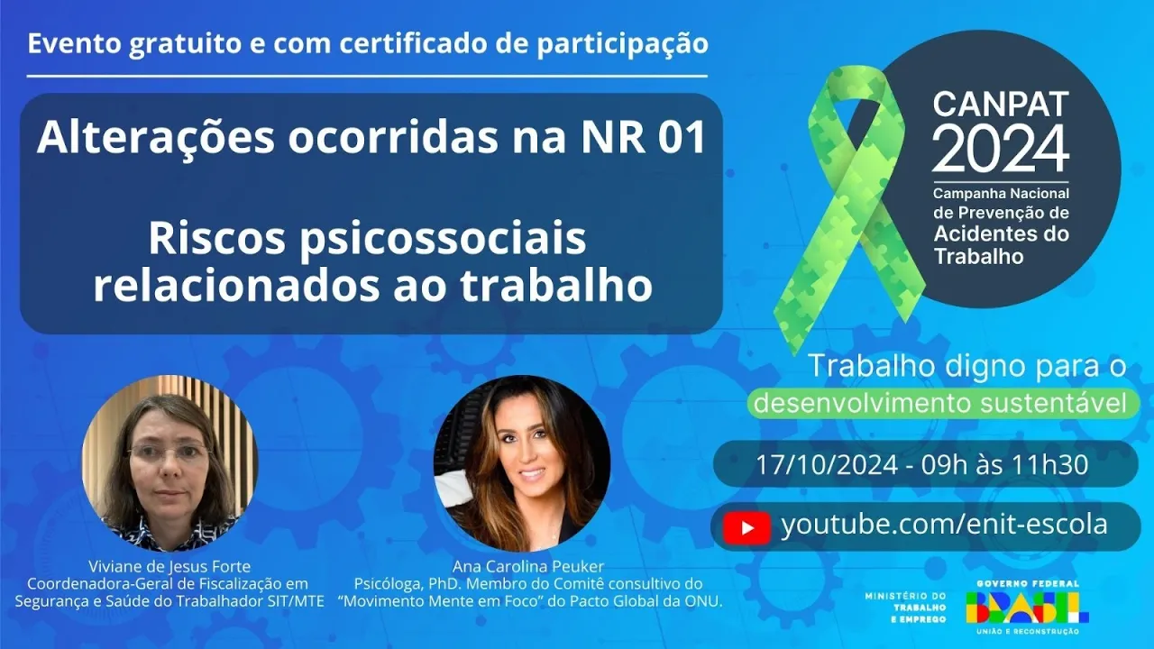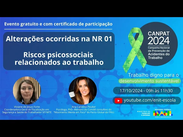 alteração decorrente agora na nr1 com a inclusão do risco psicossocial que vai entrar em vigência em maio do ano que vem é uma um assunto bastante oportuno interessante como a d Ana falou né em 2030 será a principal causa de afastamento então nós precisamos agir né todos né inspeção do trabalho empregadores trabalhadores a sociedade toda nós não podemos deixar as pessoas ficem doentes por questões psicossociais mas como todo o assunto que é introduzido em nossas normas eles são frutos de debate né então tem que é mais de 99% dos do que tá incluído é consensual