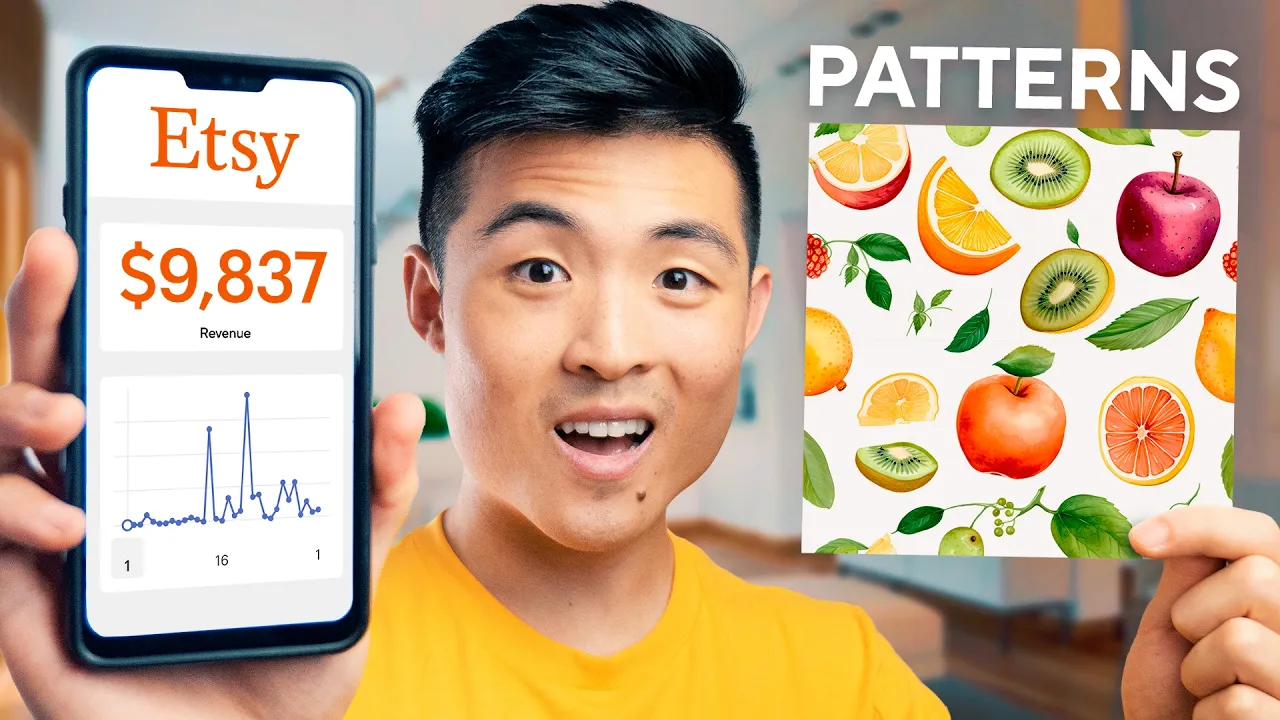 I'm gonna try to sell AI art patterns for 30 days I'll be going over the whole process from generating to uploading to advertising with people reportedly making hundreds of thousands of dollars let's see how much money I can make the first step is to pick an AI art generator I'll be specifically choosing mid-journey for its features let's generate a watercolor eggplant straight from the farm now the goal is not to generate just any art it's to generate patterns art that can be seamlessly repeated people use them to create scrapbooks cards notebook covers packaging and print on demand products like phone cases pillows and mugs the list goes on and on which makes patterns a potentially great product to sell there seems to be a big need for them this AI eggplant art does it seamlessly repeat so let's make one that does to do so with mid-journey I simply need to add the command dash dash tile to the end of my prompt this will make the art seamlessly repeat and generate an AI pattern we got eggplants for days the plan is to sell on Etsy it is an online Marketplace that focuses on arts and crafts and is a popular place to shop patterns or what they also call digital paper to determine what patterns I should sell I'm going to use etsy's search suggestions and e-ring a free Etsy keyword research tool to find popular niches that don't have too much competition some I've stumbled upon include certain types of flowers materials and food I wasn't playing with those eggplants on Etsy patterns are typically sold as a 300 DPI image that measures 3600 by 3600 pixels in resolution there's a problem mid Journey can't export AI patterns in those measurements its maximum output is 72 DPI and 1024 by 1024 pixels that's not going to cut it so I'm going to need to upscale there are many free AI image upscalers out there but I'll be using a paid one called gigapixel AI it can convert images to 300 DPI and upscale them up to six times the original resolution so instead of upscaling to the standard 3600 I'm going 6144 pixels but hook my customers up with that premium product patterns on Etsy are usually sold in packs so I'm gonna sell mine in packs of eight with all my AI patterns generated and upscaled I'm now ready to create a listing on Etsy there are five essential elements of a digital product listing that I need to complete before publishing the first is to upload my AI patterns for my buyers to download but Etsy only lets you add up to five digital files five digital files eight patterns the math doesn't add up how am I going to do this what I'm going to do is upload all my AI patterns into a full folder on Google Drve then I'm going to grab the link to it and place it in the document I'll include some branding my thanks and a reminder to leave a 5 star review I'm going to export the document as a PDF and then upload it to Etsy and there you have it problem solved next up the photos using Photoshop I've designed two templates to use one for the thumbnail which displays a title and a quick preview of all the listings patterns and one that gives a full preview of four patents with eight patterns per pack I'll need to prepare two of these per listing third on the list is pricing to be real patterns on Etsy don't sell for much they average around one to five dollars per pack on a positive note other than the initial time and money it takes to generate patterns and etsy's fees there aren't really any other costs the profit margin is 70 to 90 percent it's hot I'm gonna use e-rank's profit calculator to determine my exact pricing paying in mind etsy's fees and a 50 discount that I'm gonna apply to all my listings my final sale price will be 2. 49 the last two elements are the title and the tags I'm Gonna Fill both with pop popular keywords related to digital paper and my AI patterns Niche a few good ways to come up with keywords are by looking at similar listings Etsy search suggestions e-rank and AI using chatgpt I can easily generate a bunch of different keywords to use note that chat gbt isn't perfect so you're going to need to know how to use it properly in the description I've put a free ebook that you can download that covers the best practices when using AI for SEO and keyword research for example one of them is to be ready to fact check your SEO findings not every keyword chat GPT gives will be good so you may want to double check them with another keyword research tool like e-rank the ebook also includes tips on using AI for marketing in general a list of the most popular AI tools right now as well as a great overview of how these AI tools are being used in marketing today it's really interesting stuff that I recommend you download and check out this free resource is provided by HubSpot which is today's video sponsor a big thanks to them for hooking us up and publish the listing is live my eggplants are out and about now to create a bunch more listings and I mean a lot more let's see how many AI patterns I can sell in the next 30 days so for the past week I've been grinding I've created over 100 new listings and over 800 individual AI patterns in total all I see now are just patterns everywhere to help with creating prompts I've been using the awesome mid-journey command forward slash describe let's say I came across this pattern of oranges and wanted a prompt that could generate something similar to it I can write forward slash describe to Mid journey and then upload a file of that pattern mid Journey will then Analyze That pattern and spit out four different prompts that I can use to generate something like it's magical and has saved me a lot of time and guesswork other than that no sales so far hopefully all these new listings will bring in some soon just recently it's a good sign not a sale it's day 15 halfway into the challenge and I still got nothing with Etsy it does take some time for new listings to perkally into the search and algorithm but I got a challenge to complete it's time to crank thing