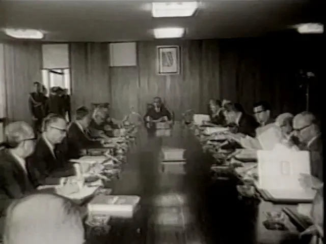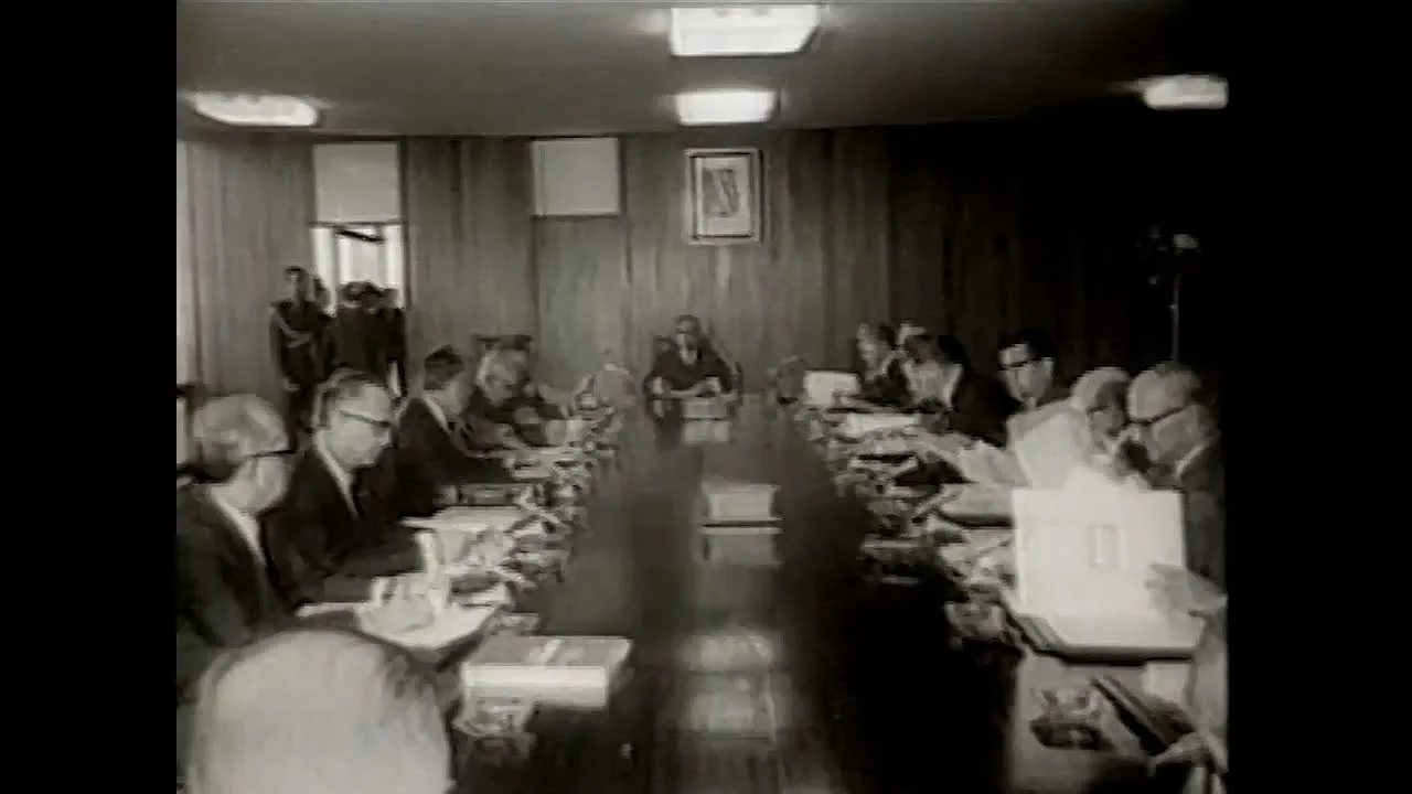 o presidente costa e silva reúne o conselho de segurança nacional no palácio laranjeiras no rio de janeiro na pauta a aprovação do ato institucional número 5 o ai-5 um conjunto de medidas que dava poderes quase absolutos ao governo militar por ordem do presidente toda a sessão é gravada costa e silva a reunião de forma dramática ao fundo pode se ouvir a sirene de carros da polícia era um aproveitando da rota afirma otto continua hora o presidente quer ouvir a opinião de todos o primeiro a falar eu vice presidente pedro aleixo o guia acompanhada em amplo