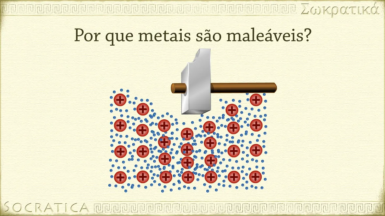 pela mobilidade do mar de elétrons se batermos com o martelo no Cristal iônico ele vai se estilhaçar isso acontece porque a força aplicada empurra os íons de cargas iguais para se juntarem eles então se repelem e acabam quebrando o cristal em contraste Se você bater em um com martelo ele não se quebra só am massa metais TM a capacidade de se deformar em resposta a uma força aplicada o mar de elétrons protege os cion uns dos outros prevenindo assim a repulsão entre eles e fazendo com que o metal possa mudar de forma o metal mais