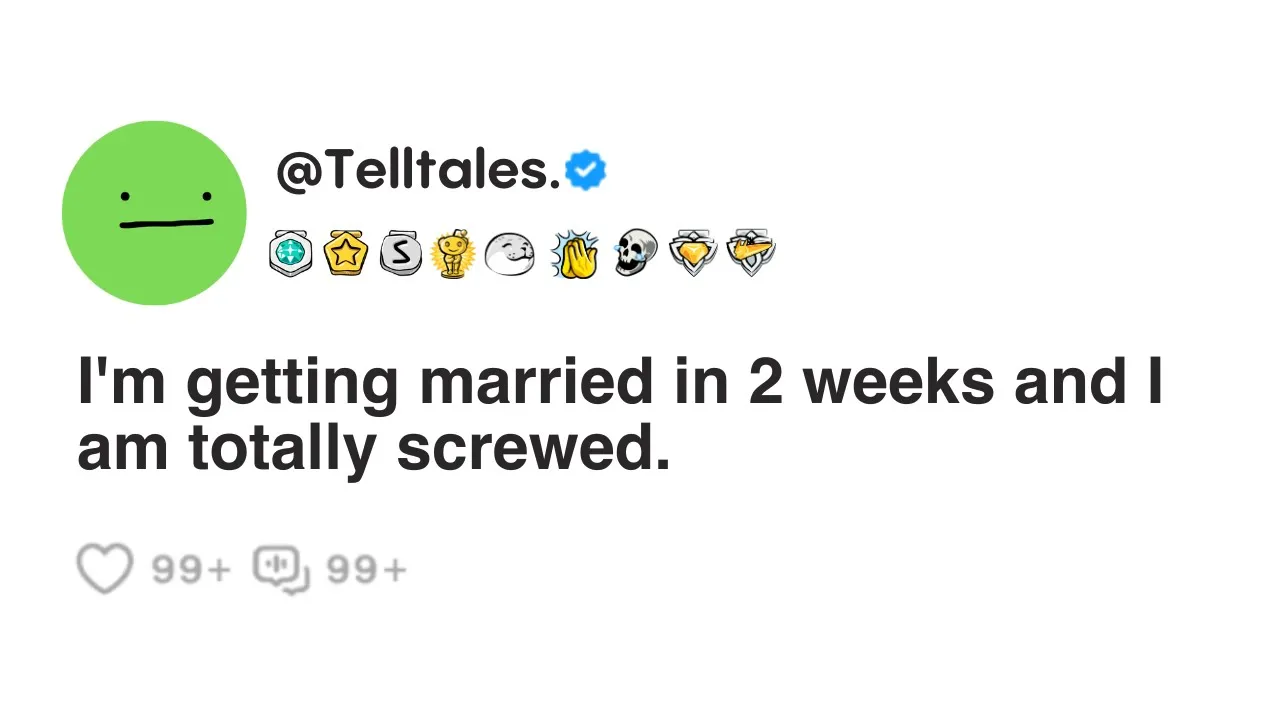 I'm getting married in two weeks and I am totally screwed I literally need to get this off my chest I feel like I'm going insane my fiance Sarah and me have known each other for about six years engaged for one our wedding is scheduled to take place in just two weeks and I just witnessed something that is making me feel like I am making the biggest mistake in my life tonight Sarah and I were taking a rare opportunity to relax At home Sarah was in the kitchen making dinner while I was out back working on