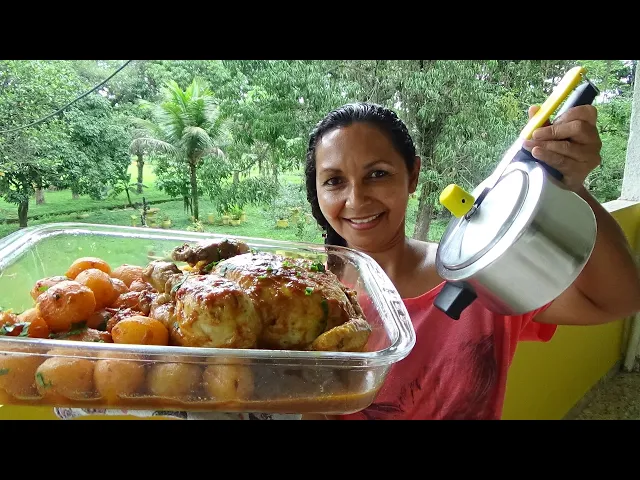 FRANGO INTEIRO NA PANELA DE PRESSÃO COM BATATAS CORADAS
