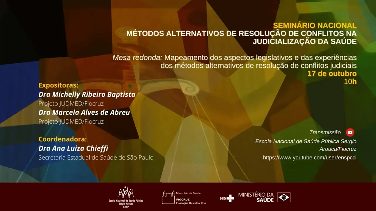de gestão das demandas judiciais da saúde da secretaria executiva do Ministério da Saúde e tem objetivo tem como objetivo discutir os principais métodos alternativos de resolução de conflitos com suas fortalezas e limitações para efetividade da resolução extrajudicial no conflito hoje teremos a segunda mesa Redonda né com título mapeamento dos aspectos legis das experiências dos métodos alternativos de resolução de conflitos judiciais com a presença das convidadas Michele Ribeiro Batista e Marcela Alves de Abreu a gente agradece muito a presença das Duas né Será concedido certificado para participação dos que assistem pelo menos 75% das mesas redondas