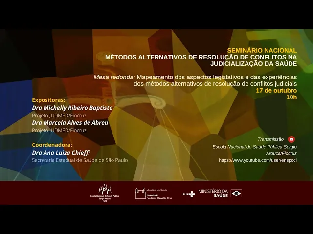 as apresentações Da Doutora Michele Ribeiro Batista e Doutora Marcela Alves de Abreu bom evento para todos eu passo a palavra produtora Ana para dar continuidade Olá bom dia a todas e todos sejam bem-vindos ao seminário Nacional de metas alternativos de resolução de conflito na judicialização da Saúde O seminário vai ocorrer já iniciou na semana passada né Então tava correndo no período de 10 de outubro a 14 de novembro todas as segundas-feiras das 10 Horas ao meio-dia com transmissão no canal da emsp no YouTube O evento é realizado por meio de parceria da índice com departamento