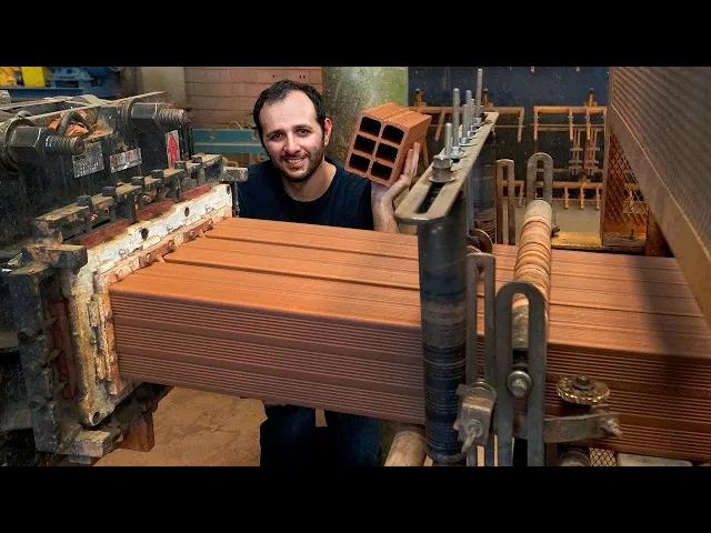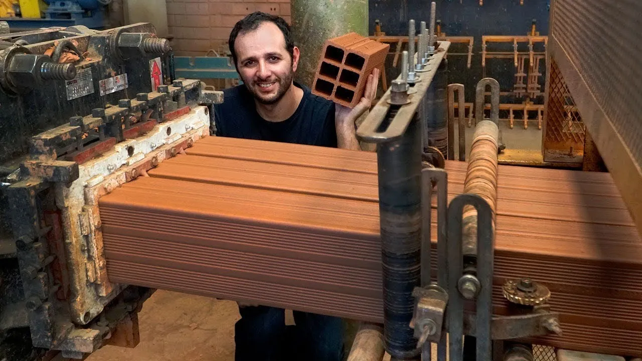 são dois cilindros de aço que espremem a mistura de argila com água e outro lado sai uma espécie de massa de pastel aqui o carro entra e é moído de novo sempre essa máquina empurra toda gila e ela já está indo à final por causa do molde em formato de tijolo infinito a mesma máquina é capaz de fazer formatos de jogos completamente diferentes é só trocar o molde a peça fica na frente que é isso aqui desse lado a gente tá vendo onde o barro entra e do outro lado a gente consegue ver a parte