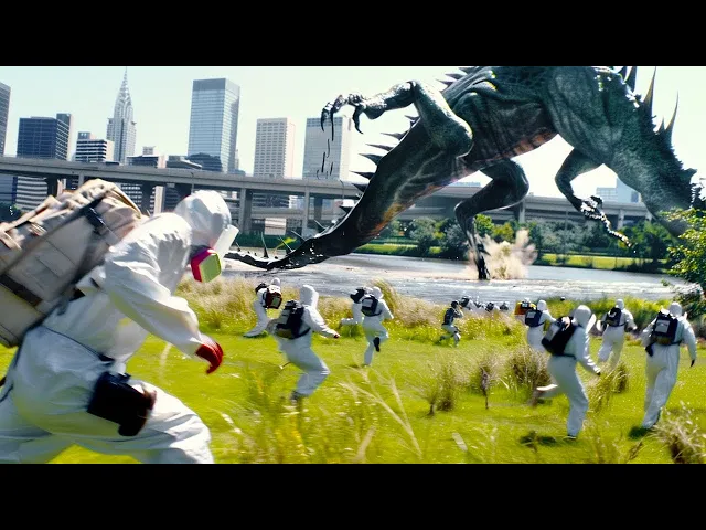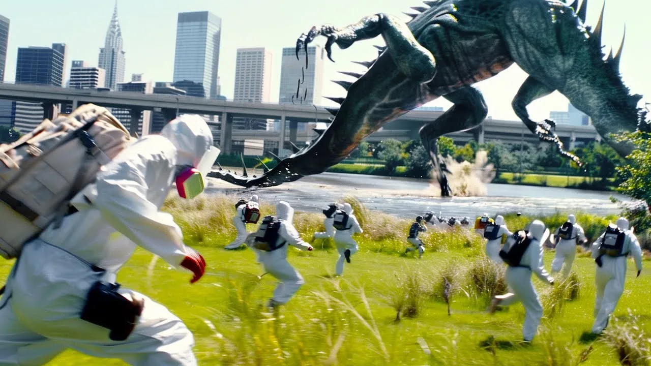 multidão corre imediatamente Mas isso não impede o monstro de pisar nelas e arrastá-las pelo chão algumas pessoas correm para se esconder dentro de um contêiner então o monstro a segue para dentro e fica preso o turista Donald e Gang do correm para a outra extremidade do contêiner abrindo a porta para que os poucos Sobreviventes possam escapar o monstro sai também e continua seu massacre então Donald joga uma telha Mas isso não machuca a criatura então Donald e Gang do levantam um poste de sinalização e o jogam também mas isso também não causa dano com uma
