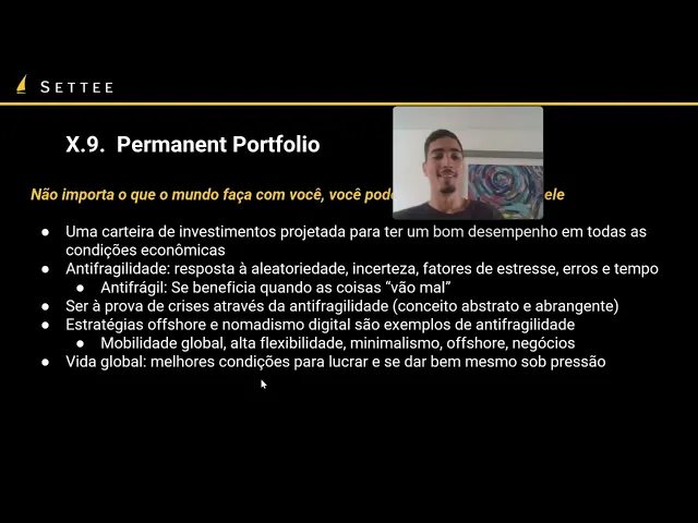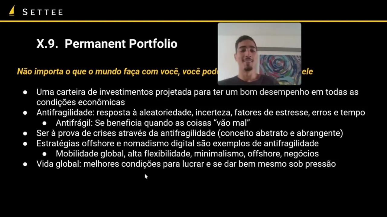 né do Nicolas na cintaleb é que é basicamente a ideia de você se beneficiar quando as coisas vão mal quando há uma crise você não é cai mas você lucra com ela então é uma ideia para você conseguir responder aleatoriedade incerteza estresse erros crises etc então a nível de investimentos portfólio e a ideia de você ter uma carteira de investimentos que vai ter um bom desempenho em todas as condições econômicas seja em crescimento seja em quebradeira então por exemplo você diversificar suas ativos em por exemplo uma parte em títulos de tesouro uma partinhações uma parte