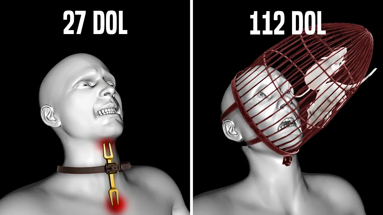 you said something wrong about the church in the Middle Ages so the Inquisition is after you now they've used a leather strap to secure a device that looks like a two-way fork with two sharp points on your neck one of its sides is pushing against your sternum and the other against your chin at first you tried to keep your head up to lessen the pain but you couldn't stay like this for long the so-called Heretics Fork wasn't deadly but made the victim suffer from the tiniest move however on the scale of pain based on scientific