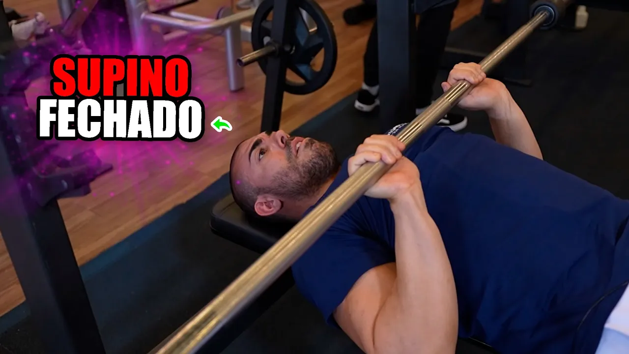 vamos executar o supino fechado agora inicialmente o supino fechado com barra que é exatamente a posição do supino Então você vai entrar aqui seu campo de visão deve ter mais ou menos a barra Ok a pegada você vai fazer ela um pouco parecida com a largura do seu ombro para menos para mais não então aqui ó mais ou menos aqui para mim tá bom Um pouquinho mais fechado ó vai tirar a barra e quando você descer não desce abrindo que eu tô desce o cotovelo apontado pra frente e fechando o cotovelo tem que passar próximo