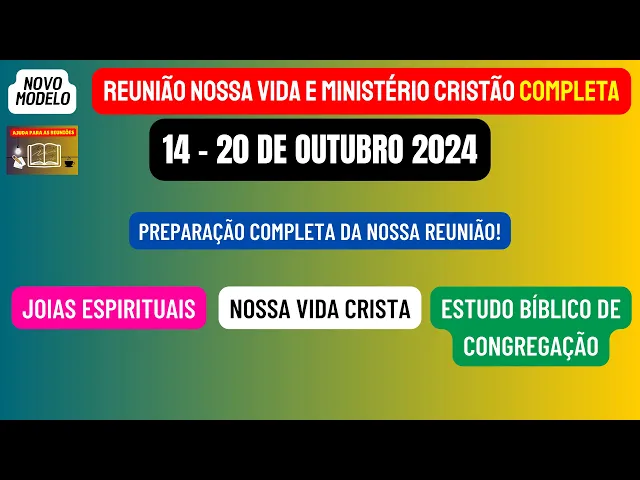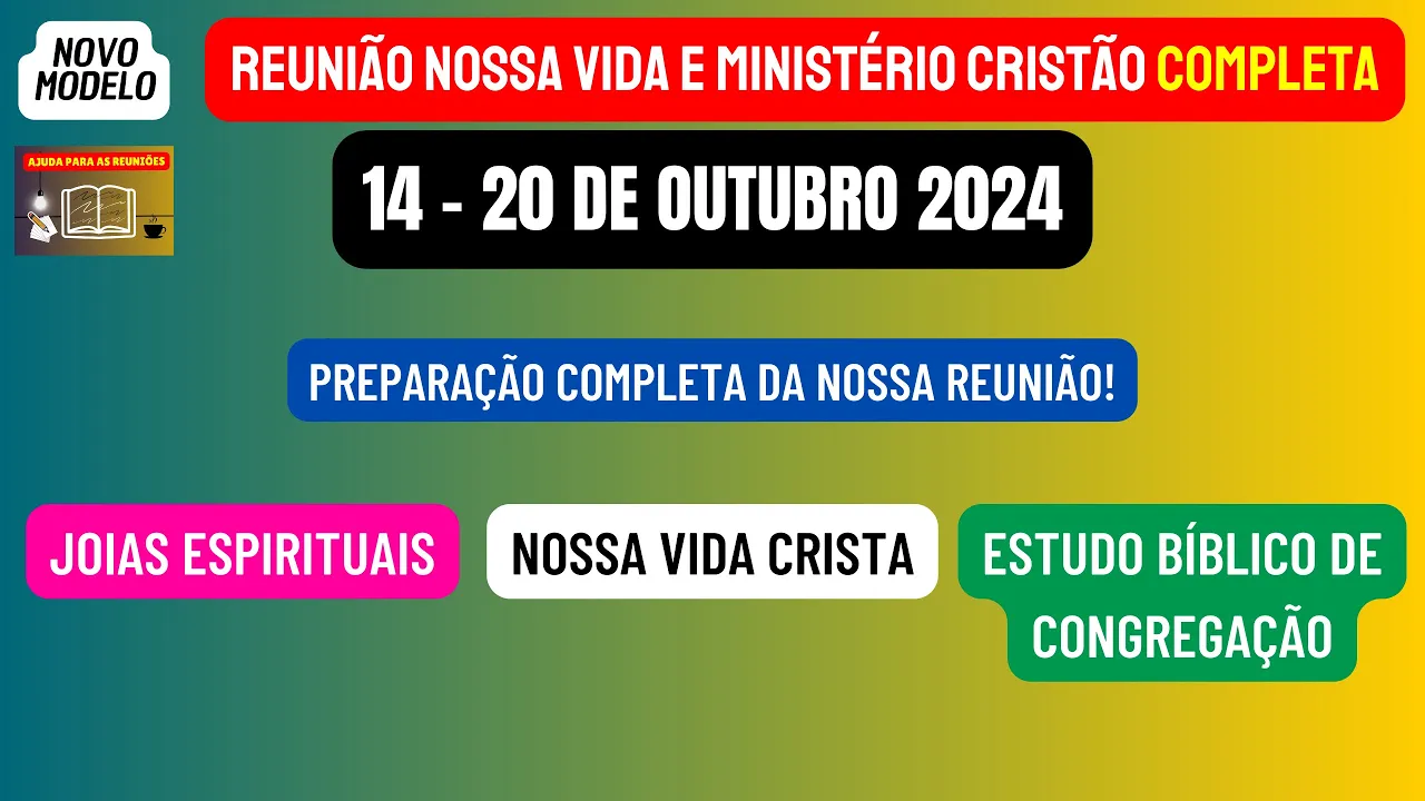 Neste vídeo vamos estar disponibilizando a reunião nossa vida e Ministério Cristão completa desta semana 14 a 20 de outubro de maneira objetiva vamos analisar e preparar as partes principais desta reunião que são aquelas por perguntas e respostas onde podemos dar nossos valiosos frutos de lábios nossos comentários e nesse ano vamos fazer uma preparação das joias espirituais que podemos encontrar na leitura dos Salmos 96 a 99 Lembrando que esse texto é a base de toda a nossa reunião depois passando para a sessão nossa vida cristã teremos necessidades locais que será feito por um Ancião da sua