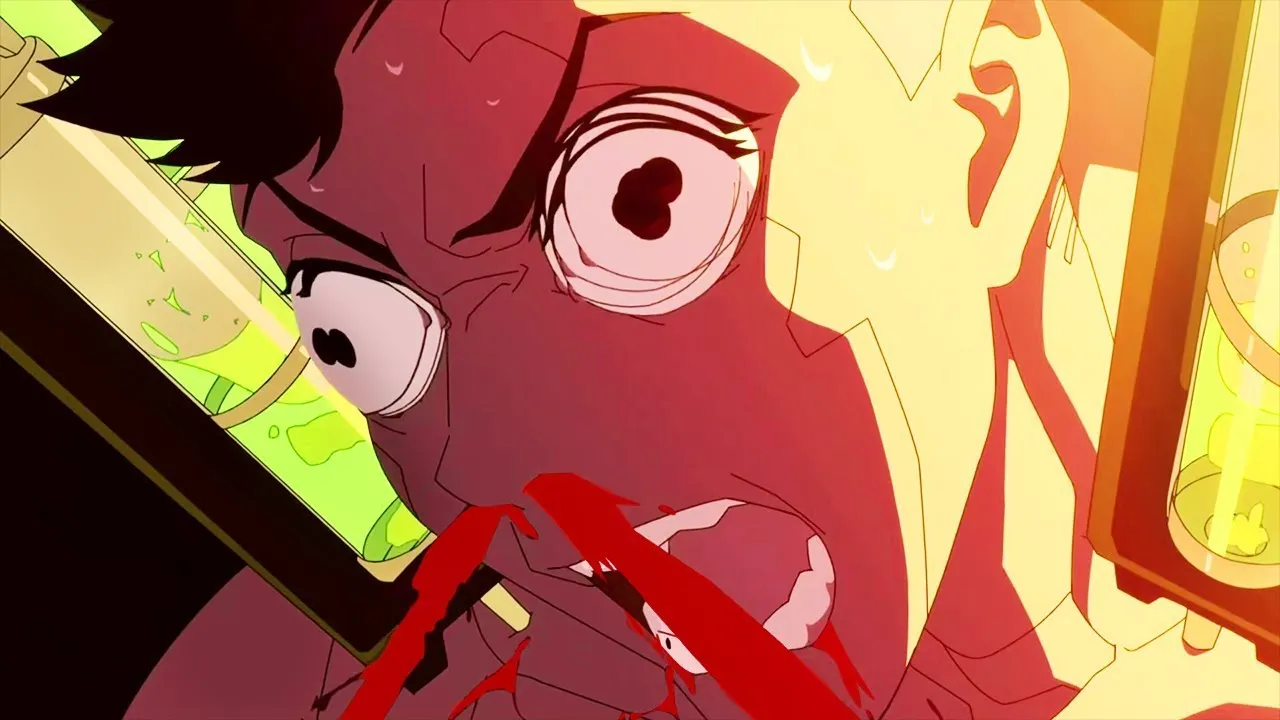 o melhor lugar para se esconder Lucia então repara que David estava tendo tremedeira que é o efeito colateral de usar tantos implantes e diz estar preocupada com ele então o casal se abraça confortando um ao outro e em seguida vemos Lucy indo atrás de alguém e finalizando essa pessoa rapidamente em outro dia vemos que a gang estava fazendo uma missão com o objetivo de de conseguir dados de um escritório da arasaka David vai até o escritório onde acaba perdendo a razão e devido ao surto ele tira a vida de dois inocentes mas ao voltar para