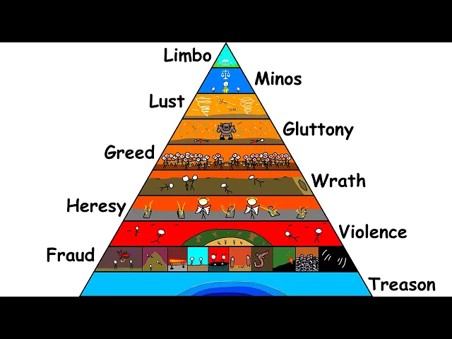 this punishment is because according to the principle of contrap Paso those who always ate are now being eaten most of the people here are laying down and playing dead so Cerberus doesn't get to them and when it tried to go for Dante Virgil who is his guide threw dirt in its three mouths distracting it it's at this level that we learn that on Judgment Day everyone's soul will be reunited with their body and be in a state of perfection but while Perfection sounds good in heaven in hell it means perfect suffering level four greed when