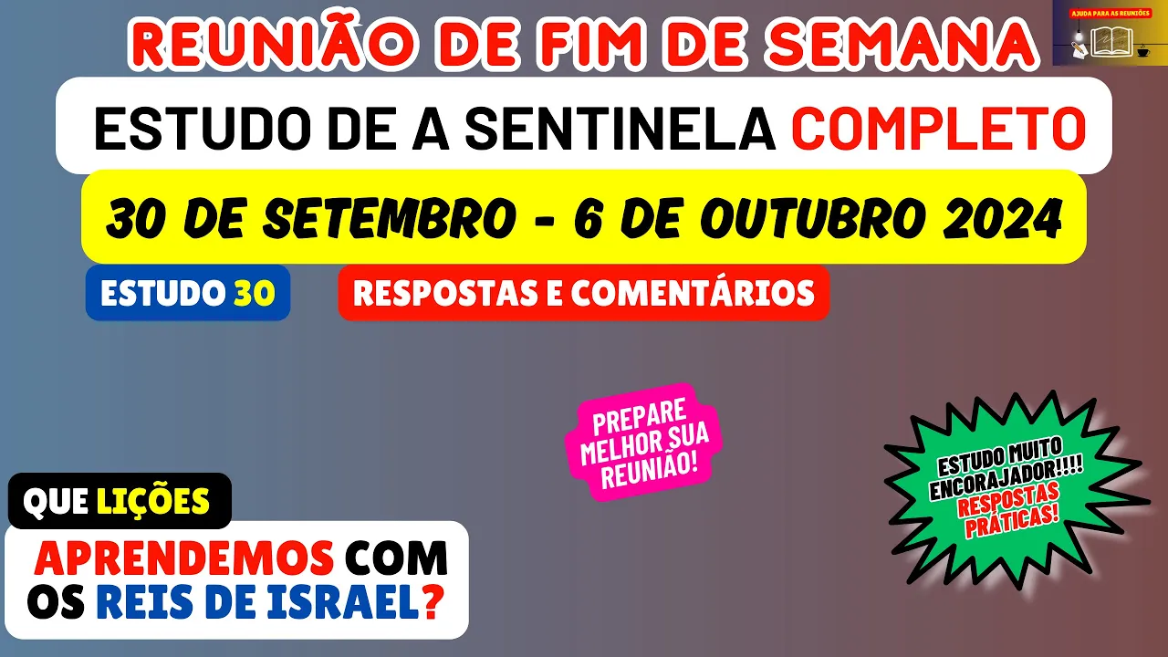 Neste vídeo vamos de maneira objetiva analisar e preparar o estudo 30 da revista A Sentinela este artigo vai ser considerado na reunião deste fim de semana 30 de setembro a 6 de outubro esperamos de coração que mais uma vez todos vocês possam tirar bastante proveito Dos comentários nesta preparação [Música] então o tema do estudo 30 é uma pergunta que lições aprendemos com os reis de Israel Esse estudo tem como base o texto de Malaquias capítulo 3 Versículo 18 que diz Vocês verão novamente a diferença entre uma pessoa justa e uma pessoa má entre quem serve