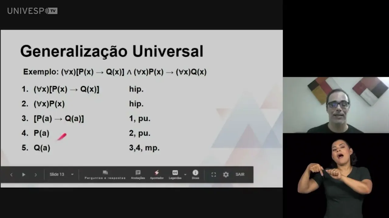 particularizei aqui então eu aplico a particularização universal para essa mesma constante e agora cair um esquema de lógica entre aspas e proposicional no sentido que agora eu tô trabalhando com algo definido posso aplicar modos pôneis deduzir o que de a e pronto tenho a minha a dedução final na generalização Universal eu aqui eu tenho que tomar mais cuidado no sentido de que eu vou de um caso particular falar que é válido para todo mundo para isso então eu vou ter que ter restrições tomar cuidado com restrições relacionadas ao predicado Então nesse caso por exemplo não