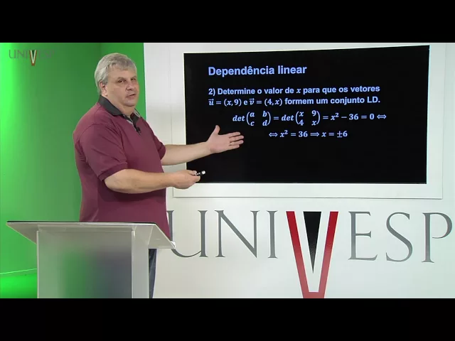 mesma reta por um determinante consigo verifica isso determina o valor de x para que esses dois vetores formam um conjunto l de de novo vamos usar um determinante o determinante pega os condenados o primeiro vetor x-9 condenado segundo vetor 4 x 1 e segue determinante vai dar x quadrado - 36 pra que eles formam um conjunto l de eu quero que essa conta seria igual a zero portanto x quadrado vai ter que chegou a 36 então x é igual a mais ou menos 66 x for 6 ou menos seis esses dois vetores formam um conjunto