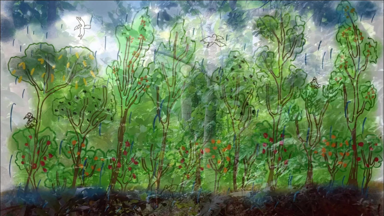 strata of the plants and these life cycles we can create and attain that optimal and functional density and diversity over time and space so for example all those plants that we saw in that diagram previously we can see play out like this so in the first year we would have our avocado tree in amongst our tamarillo tree in amongst our churro moya tree in amongst our eucalypt tree in amongst our inga bean also planting in our annuals that we mentioned corn beans and pumpkin fast forward to 20 years here we have our mature emergent inga